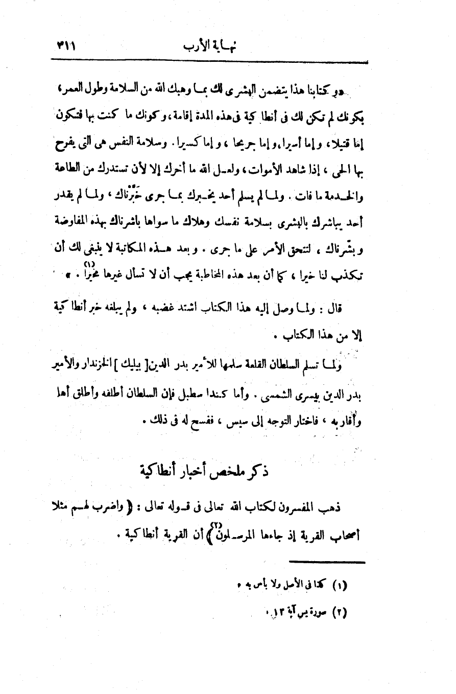 «وكتابنا هذا يتضمن البشرى لك بما وهبك الله من السلامة وطول العمر، بكونك لم تكن لك فى أنطاكية فى هذه المدة إقامة، وكونك ما كنت بها فتكون إما قتيلا، وإما أسيرا، وإما جريحا، وإما كسيرا. وسلامة النفس هى التى يفرح بها الحى، إذا شاهد الأموات، ولعل الله ما أخرك إلا لأن تستدرك من الطاعة والخدمة ما فات. ولما لم يسلم أحد يخبرك بما جرى خبّرناك، ولما لم يقدر أحد يباشرك بالبشرى بسلامة نفسك وهلاك ما سواها باشرناك بهذه المفاوضة وبشّرناك، لتتحق الأمر على ما جرى. وبعد هذه المكاتبة لا ينبغى لك أن تكذب لنا خيرا، كما أن بعد هذه المخاطبة يجب أن لا تسأل غيرها مخيرا «1» .»