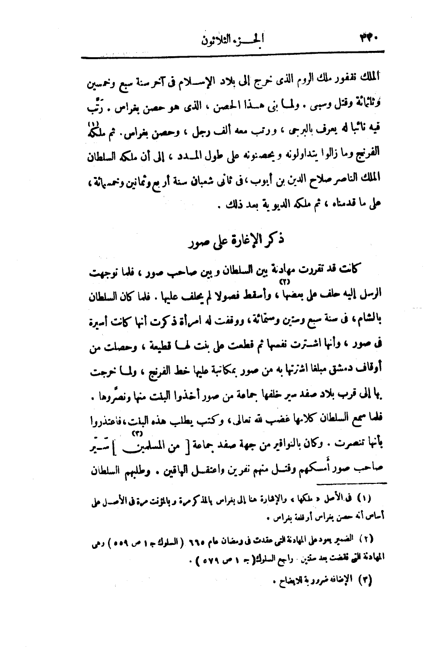 كانت قد تقررت مهادنة بين السلطان وبين صاحب صور، فلما توجهت الرسل إليه حلف على بعضها «2» ، وأسقط فصولا لم يحلف عليها. فلما كان السلطان بالشام، فى سنة سبع وستين وستمائة، ووقفت له امرأة ذكرت أنها كانت أسيرة فى صور، وأنها اشترت نفسها ثم قطعت على بنت لها قطيعة، وحصلت من أوقاف دمشق مبلغا اشترتها به من صور بمكاتبة عليها خط الفرنج، ولما خرجت بها إلى قرب بلاد صفد سير خلفها جماعة من صور أخذوا البنت منها ونصّروها.