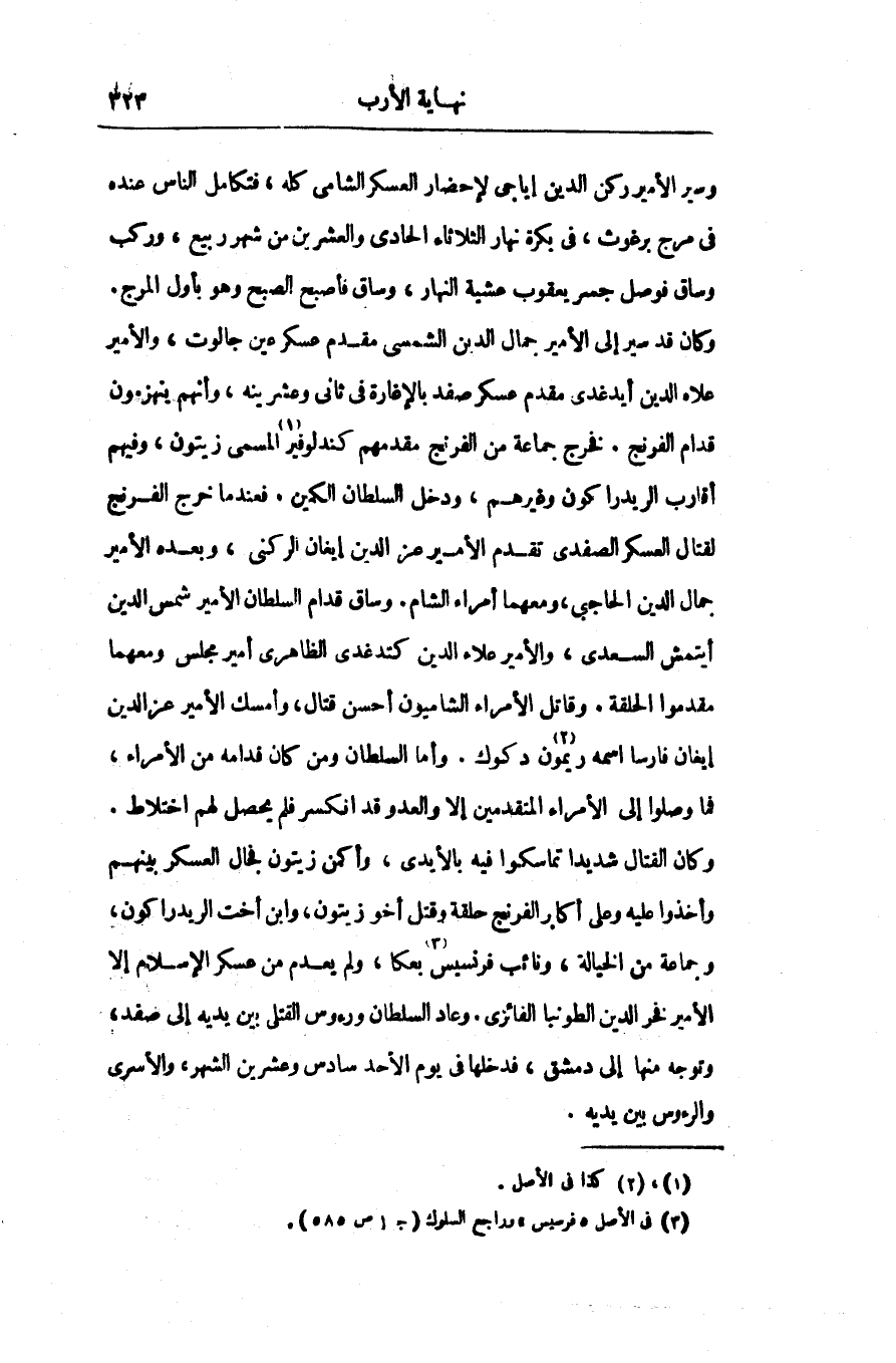 وكان القتال شديدا تماسكوا فيه بالأيدى، وأكمن زيتون فجال العسكر بينهم وأخذوا عليه وعلى أكابر الفرنج حلقة وقتل أخو زيتون، وابن أخت الريدراكون، وجماعة من الخيالة، ونائب فرنسيس «3» بعكا، ولم يعدم من عسكر الإسلام إلا الأمير فخر الدين الطونبا الفائزى. وعاد السلطان ورءوس القتلى بين يديه إلى صفد، وتوجه منها إلى دمشق، فدخلها فى يوم الأحد سادس وعشرين الشهر، والأسرى والرءوس بين يديه.