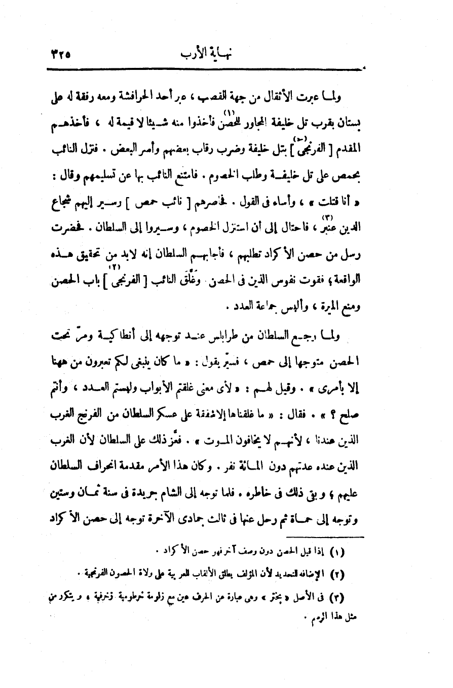 ولما عبرت الأثقال من جهة القصب، عبر أحد الحرافشة ومعه رفقة له على بستان بقرب تل خليفة المجاور للحصن «1» فأخذوا منه شيئا لا قيمة له، فأخذهم المقدم [الفرنجى «2» ] بتل خليفة وضرب رقاب بعضهم وأسر البعض. فنزل النائب بحمص على تل خليفة وطلب الخصوم. فامتنع النائب بها عن تسليمهم وقال:
