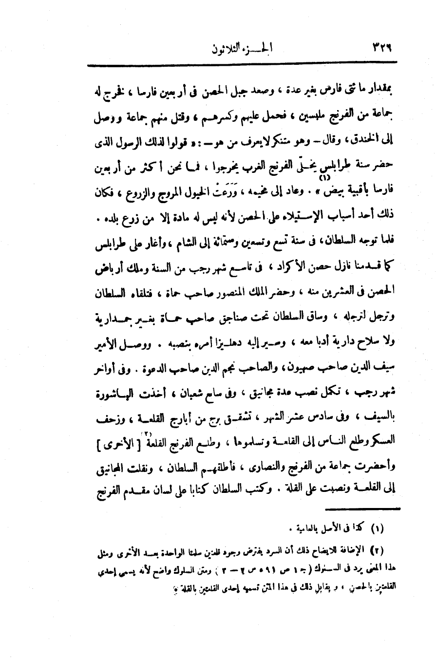 بمقدار مائتى فارس بغير عدة، وصعد جبل الحصن فى أربعين فارسا، فخرج له جماعة من الفرنج ملبسين، فحمل عليهم وكسرهم، وقتل منهم جماعة ووصل إلى الخندق، وقال- وهو متنكر لا يعرف من هو-: «قولوا لذلك الرسول الذى حضر سنة طرابلس يخلّى الفرنج الغرب يخرجوا، فما نحن أكثر من أربعين فارسا بأقبية بيض» «1» . وعاد إلى مخيمه، ورعت الخيول المروج والزروع، فكان ذلك أحد أسباب الإستيلاء على الحصن لأنه ليس له مادة إلا من زرع بلده.