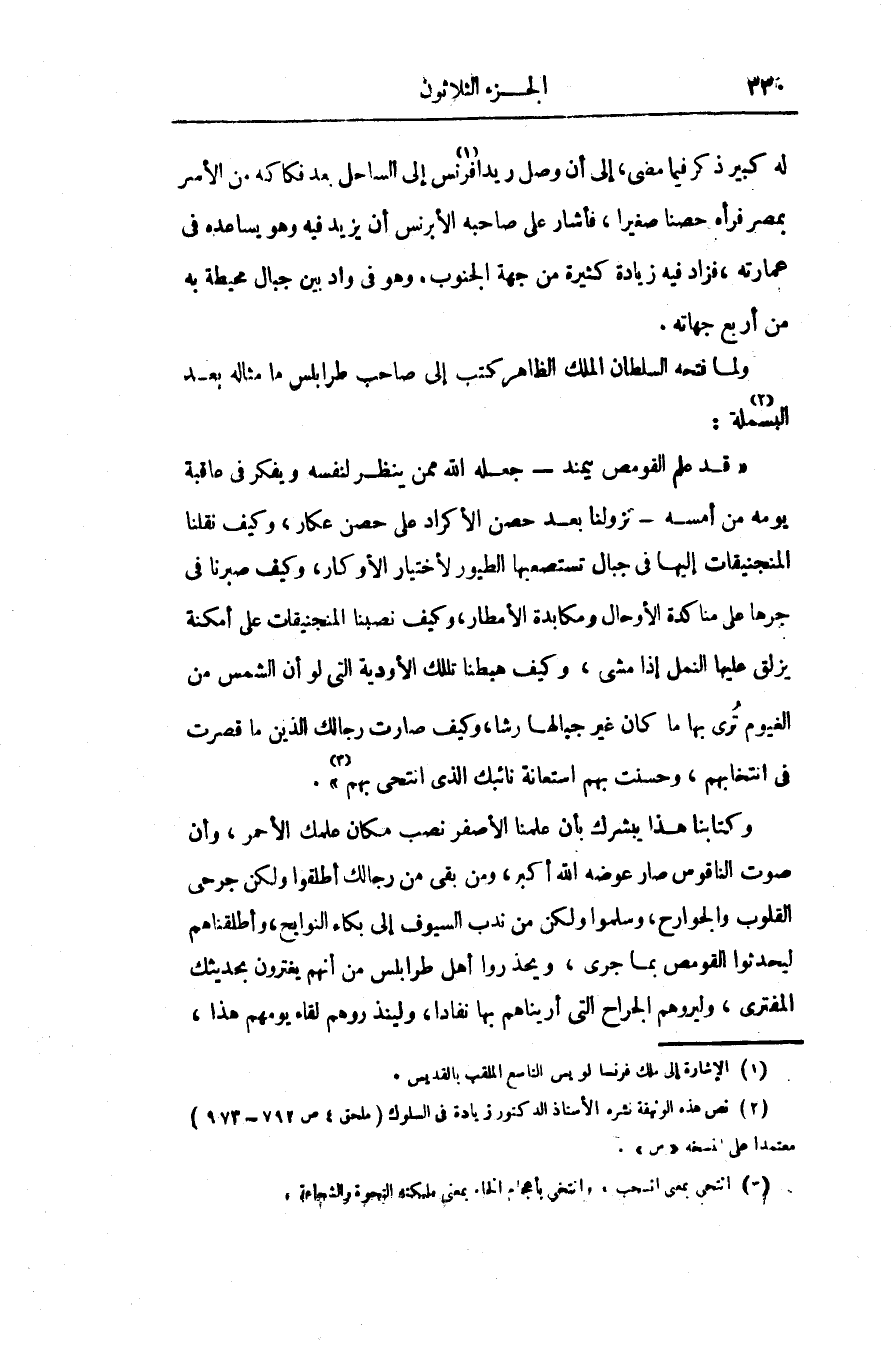 وكتابنا هذا يبشرك بأن علمنا الأصفر نصب مكان علمك الأحمر، وأن صوت الناقوس صار عوضه الله أكبر، ومن بقى من رجالك أطلقوا ولكن جرحى القلوب والجوارح، وسلموا ولكن من ندب السيوف إلى بكاء النوايح، وأطلقناهم ليحدثوا القومص بما جرى، ويحذروا أهل طرابلس من أنهم يغترون بحديثك المفترى، وليروهم الجراح التى أريناهم بها نفادا، ولينذروهم لقاء يومهم هذا،