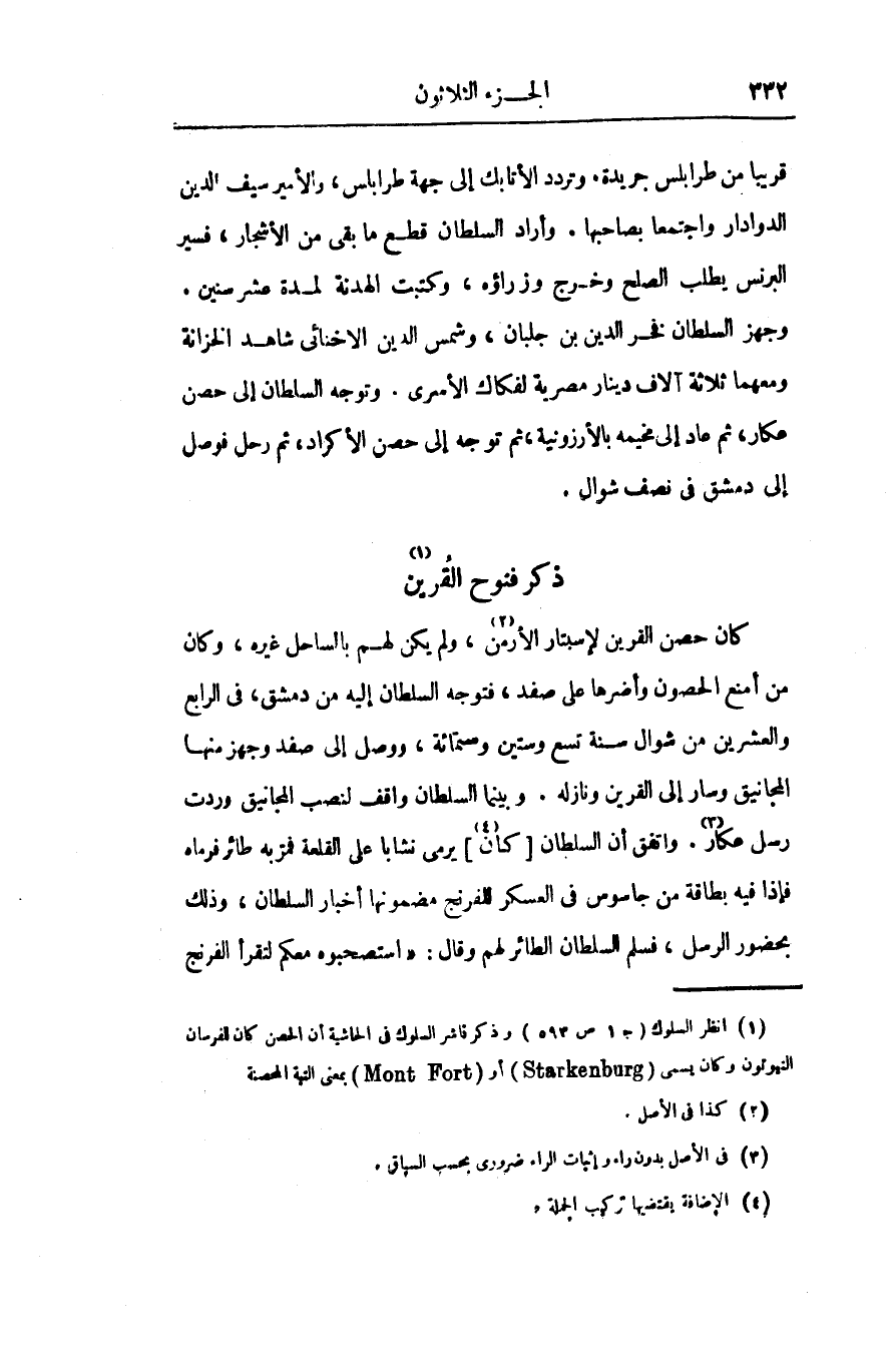 كان حصن القرين لإسبتار الأرمن «2» ، ولم يكن لهم بالساحل غيره، وكان من أمنع الحصون وأضرها على صفد، فتوجه السلطان إليه من دمشق، فى الرابع والعشرين من شوال سنة تسع وستين وستمائة، ووصل إلى صفد وجهز منها المجانيق وسار إلى القرين ونازله. وبينما السلطان واقف لنصب المجانيق وردت رسل عكار «3» . واتفق أن السلطان [كان «4» ] يرمى نشابا على القلعة فمرّ به طائر فرماه فإذا فيه بطاقة من جاسوس فى العسكر للفرنج مضمونها أخبار السلطان، وذلك بحضور الرسل، فسلم السلطان الطائر لهم وقال: «استصحبوه معكم لتقرأ الفرنج