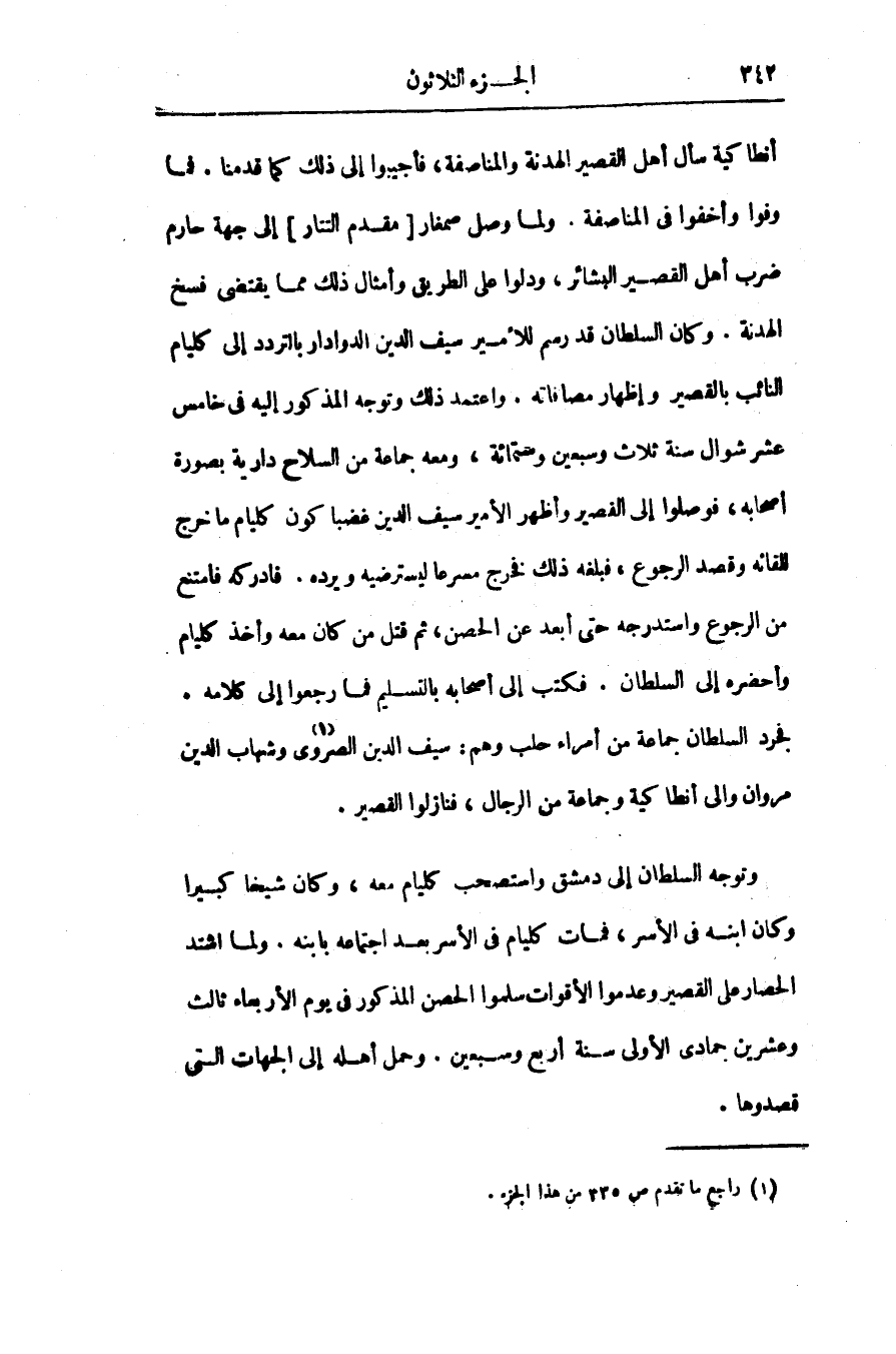وتوجه السلطان إلى دمشق واستصحب كليام معه، وكان شيخا كبيرا وكان ابنه فى الأسر، فمات كليام فى الأسر بعد اجتماعه بابنه. ولما اشتد الحصار على القصير وعدموا الأقوات سلموا الحصن المذكور فى يوم الأربعاء ثالث وعشرين جمادى الأولى سنة أربع وسبعين. وحمل أهله إلى الجهات التى قصدوها.