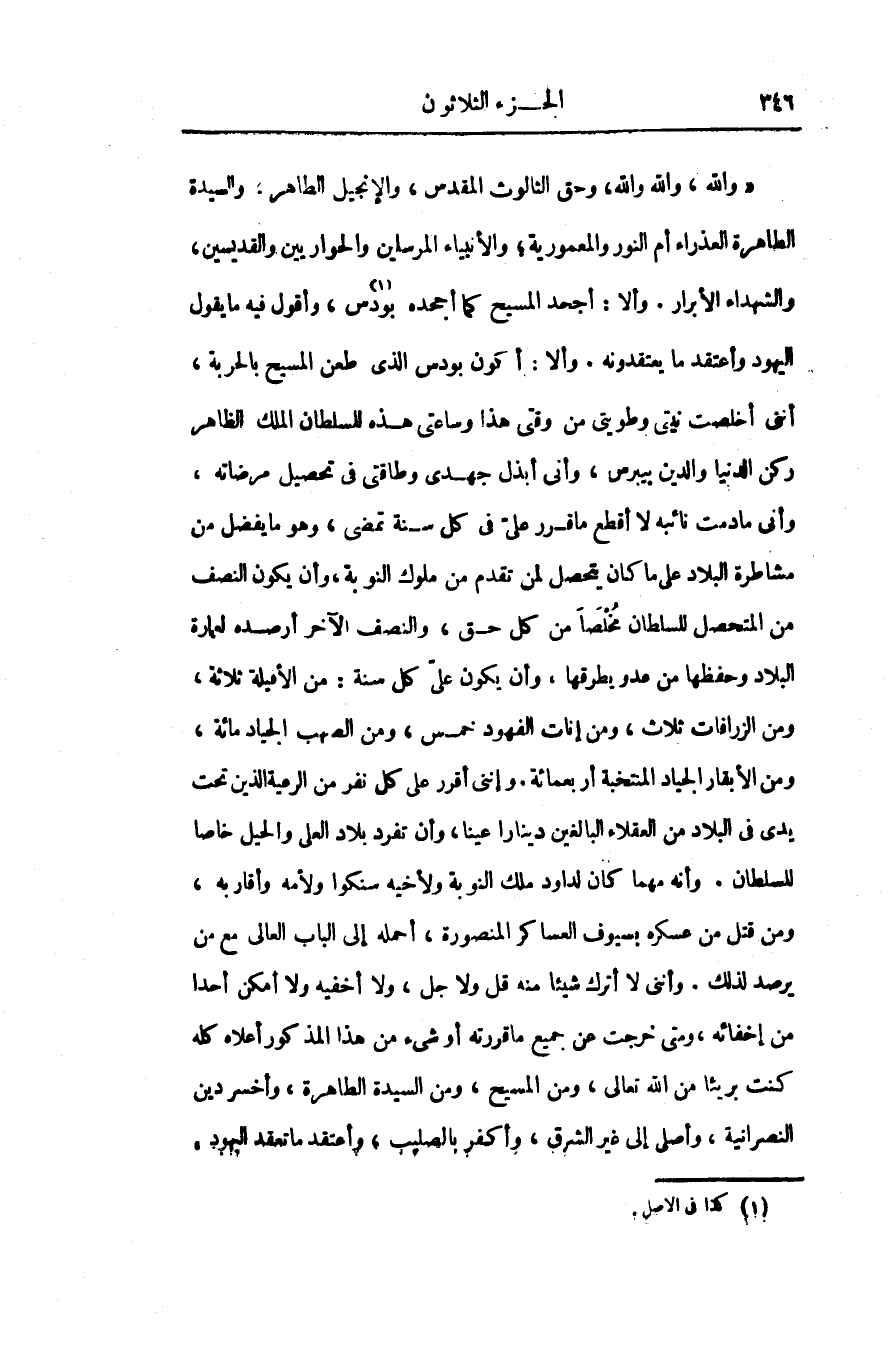 «والله، والله والله، وحق الثالوث المقدس، والإنجيل الطاهر، والسيدة الطاهرة العذراء أم النور والمعمورية؛ والأنبياء المرسلين والحواريين والقديسين، والشهداء الأبرار. وألا: أجحد المسيح كما أجحده بودس «1» ، وأقول فيه ما يقول اليهود وأعتقد ما يعتقدونه. وألا: أكون بودس الذى طعن المسيح بالحربة، أننى أخلصت نيتى وطويتى من وقتى هذا وساعتى هذه للسلطان الملك الظاهر ركن الدنيا والدين بيبرس، وأنى أبذل جهدى وطاقتى فى تحصيل مرضاته، وأنى مادمت نائبه لا أقطع ما قرر علىّ فى كل سنة تمضى، وهو ما يفضل من مشاطرة البلاد على ما كان يتحصل لمن تقدم من ملوك النوبة، وأن يكون النصف من المتحصل للسلطان مخلصا من كل حق، والنصف الآخر أرصده لعمارة البلاد وحفظها من عدو يطرقها، وأن يكون علىّ كل سنة: من الأفيلة ثلاثة، ومن الزرافات ثلاث، ومن إنات الفهود خمس، ومن الصهب الجياد مائة، ومن الأبقار الجياد المنتخبة أربعمائة. وإننى أقرر على كل نفر من الرعية الذين تحت يدى فى البلاد من العقلاء البالغين دينارا عينا، وأن تفرد بلاد العلى والحيل خاصا للسلطان. وأنه مهما كان لداود ملك النوبة ولأخيه سنكوا ولأمه وأقاربه، ومن قتل من عسكره بسيوف العساكر المنصورة، أحمله إلى الباب العالى مع من يرصد لذلك. وأننى لا أترك شيئا منه قل ولا جل، ولا أخفيه ولا أمكن أحدا من إخفائه، ومتى خرجت عن جميع ما قررته أو شىء من هذا المذكور أعلاه كله كنت بريئا من الله تعالى، ومن المسيح، ومن السيدة الطاهرة، وأخسر دين النصرانية، وأصلى إلى غير الشرق، وأكفر بالصليب، وأعتقد ما تعقد اليهود.
