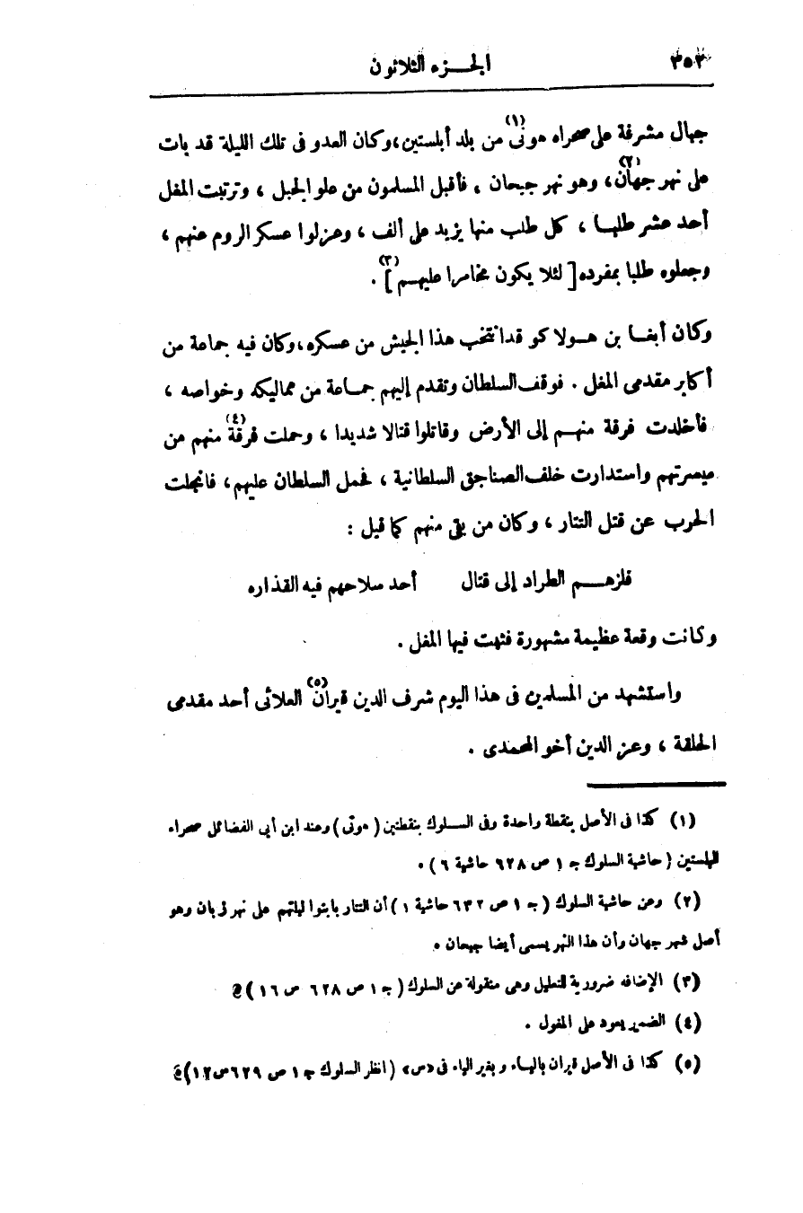 جبال مشرفة على صحراه هونى «1» من بلد أبلستين، وكان العدو فى تلك الليلة قد بات على نهر جهان «2» ، وهو نهر جيحان، فأقبل المسلمون من علو الجبل، وترتبت المغل أحد عشر طلبا، كل طلب منها يزيد على ألف، وعزلوا عسكر الروم عنهم، وجعلوه طلبا بمفرده [لئلا يكون مخامرا عليهم «3» ] .