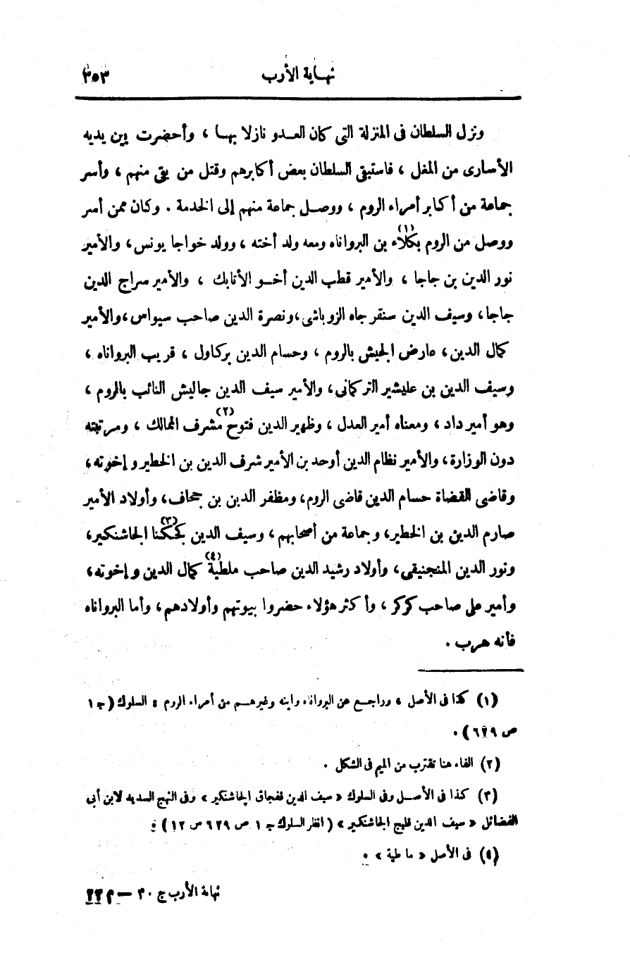 ونزل السلطان فى المنزلة التى كان العدو نازلا بها، وأحضرت بين يديه الأسارى من المغل، فاستبقى السلطان بعض أكابرهم وقتل من بقى منهم، وأسر جماعة من أكابر أمراء الروم، ووصل جماعة منهم إلى الخدمة. وكان ممن أسر ووصل من الروم بكلاء «1» بن البرواناه ومعه ولد أخته، وولد خواجا يونس، والأمير نور الدين بن جاجا، والأمير قطب الدين أخو الأتابك، والأمير سراج الدين جاجا، وسيف الدين سنقرجاه الزوباشى، ونصرة الدين صاحب سيواس، والأمير كمال الدين، عارض الجيش بالروم، وحسام الدين بركاول، قريب البرواناه، وسيف الدين بن عليشير التركمانى، والأمير سيف الدين جاليش النائب بالروم، وهو أمير داد، ومعناه أمير العدل، وظهير الدين فتوح «2» مشرف الممالك، ومرتبته دون الوزارة، والأمير نظام الدين أوحد بن الأمير شرف الدين بن الخطير وإخوته، وقاضى القضاة حسام الدين قاضى الروم، ومظفر الدين بن جحاف، وأولاد الأمير صارم الدين بن الخطير، وجماعة من أصحابهم، وسيف الدين كجكنا «3» الجاشنكير، ونور الدين المنجنيقى، وأولاد رشيد الدين صاحب ملطية «4» كمال الدين وإخوته، وأمير على صاحب كركر، وأكثر هؤلاء حضروا بيوتهم وأولادهم، وأما البرواناه فأنه هرب.