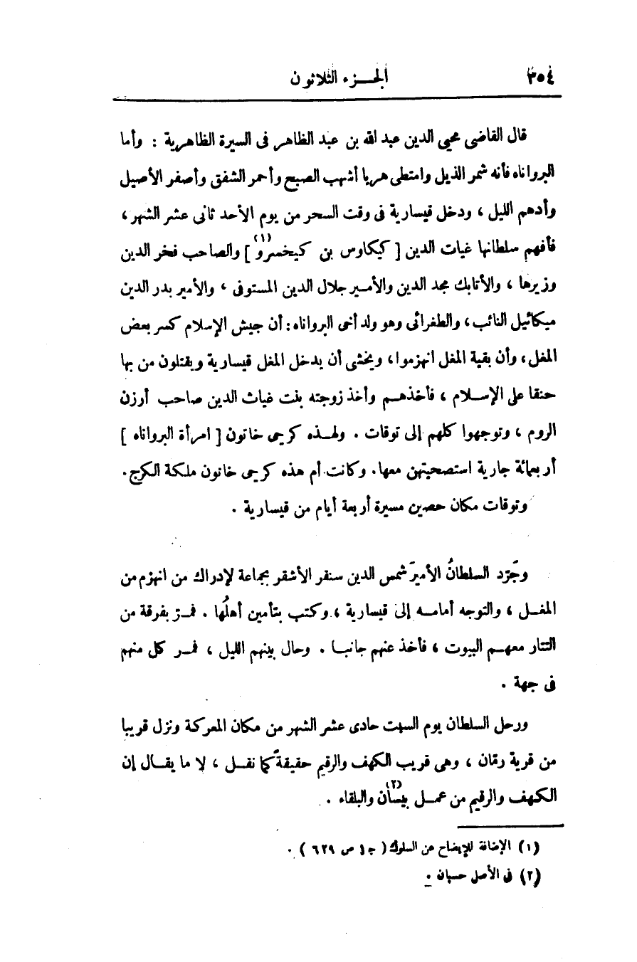 قال القاضى محيى الدين عبد الله بن عبد الظاهر فى السيرة الظاهرية: وأما البرواناه فأنه شمر الذيل وامتطى هربا أشهب الصبح وأحمر الشفق وأصفر الأصيل وأدهم الليل، ودخل قيسارية فى وقت السحر من يوم الأحد ثانى عشر الشهر، فأفهم سلطانها غياث الدين [كيكاوس بن كيخسرو «1» ] والصاحب فخر الدين وزيرها، والأتابك مجد الدين والأمير جلال الدين المستوفى، والأمير بدر الدين ميكائيل النائب، والطغرائى وهو ولد أخى البرواناه: أن جيش الإسلام كسر بعض المغل، وأن بقية المغل انهزموا، ويخشى أن يدخل المغل قيسارية ويقتلون من بها حنقا على الإسلام، فأخذهم وأخذ زوجته بنت غياث الدين صاحب أرزن الروم، وتوجهوا كلهم إلى توقات. ولهذه كرحى خاتون [امرأة البرواناه] أربعمائة جارية استصحيتهن معها. وكانت أم هذه كرحى خاتون ملكة الكرج.