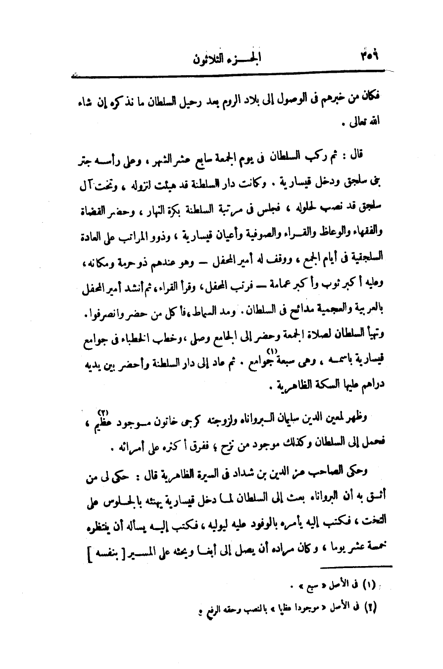 قال: ثم ركب السلطان فى يوم الجمعة سابع عشر الشهر، وعلى رأسه جتر بنى سلجق ودخل قيسارية. وكانت دار السلطنة قد هيئت لنزوله، وتخت آل سلجق قد نصب لحلوله، فجلس فى مرتبة السلطنة بكرة النهار، وحضر القضاة والفقهاء والوعاظ والقراء والصوفية وأعيان قيسارية، وذوو المراتب على العادة السلجقية فى أيام الجمع، ووقف له أمير المحفل- وهو عندهم ذو حرمة ومكانه، وعليه أكبر ثوب وأكبر عمامة- فرتب المحفل، وقرأ القراء، ثم أنشد أمير المحفل بالعربية والعجمية مدائح فى السلطان. ومد السماط، فأكل من حضر وانصرفوا.
