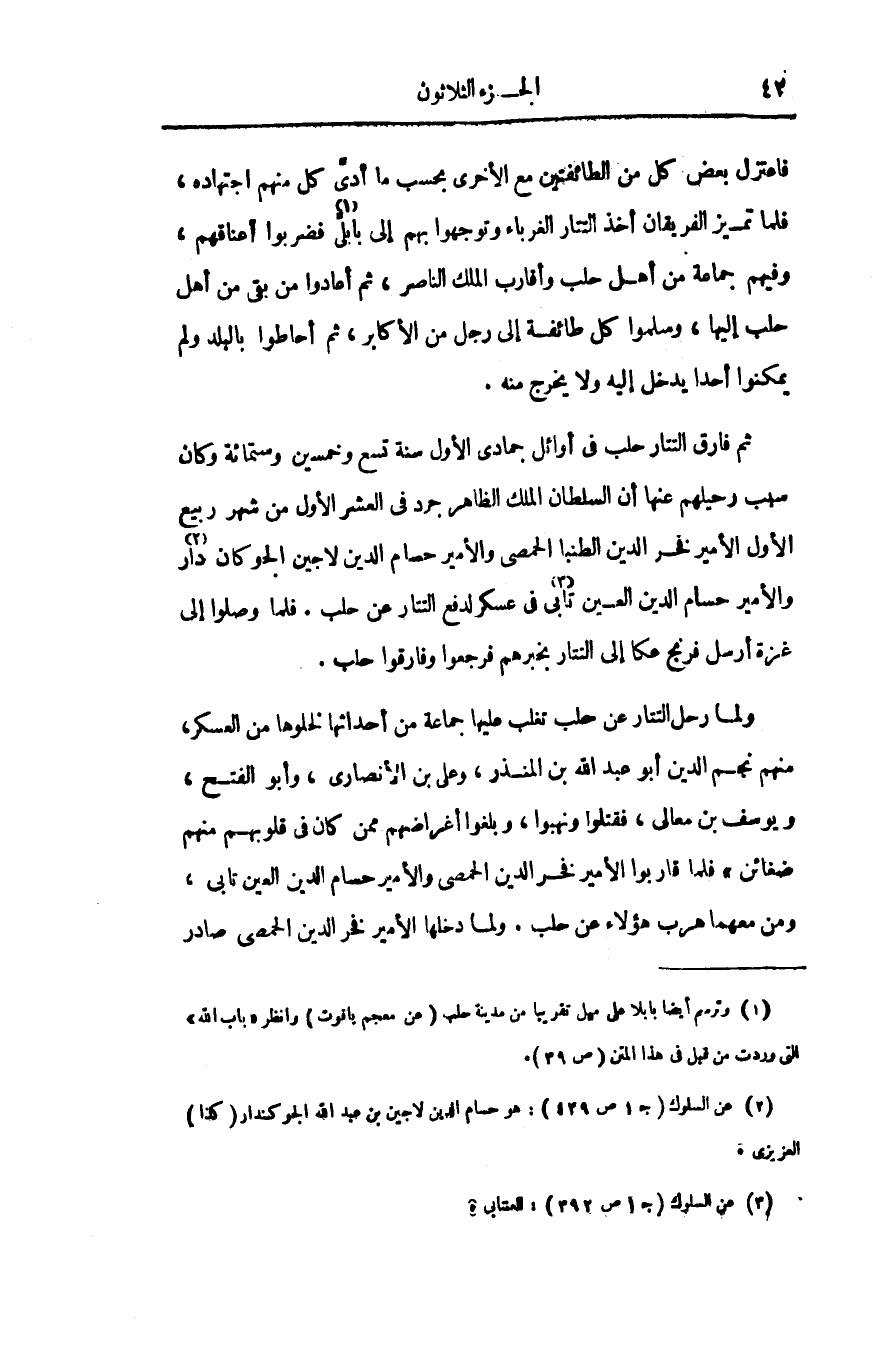 ثم فارق التتار حلب فى أوائل جمادى الأول سنة تسع وخمسين وستمائة وكان سبب رحيلهم عنها أن السلطان الملك الظاهر جرد فى العشر الأول من شهر ربيع الأول الأمير فخر الدين الطنبا الحمصى والأمير حسام الدين لاجين الجو كان دار «2» والأمير حسام الدين العين تابى «3» فى عسكر لدفع التتار عن حلب. فلما وصلوا إلى غزة أرسل فرنج عكا إلى التتار بخبرهم فرجعوا وفارقوا حلب.