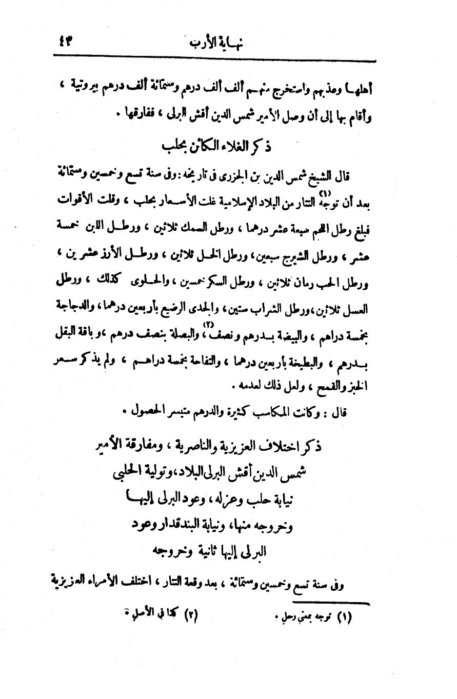 قال الشيخ شمس الدين بن الجزرى فى تاريخه: وفى سنة تسع وخمسين وستمائة بعد أن توجه «1» التتار من البلاد الإسلامية غلت الأسعار بحلب، وقلت الأقوات فبلغ رطل اللحم سبعة عشر درهما، ورطل السمك ثلاثين، ورطل اللبن خمسة عشر، ورطل الشيرج سبعين، ورطل الخل ثلاثين، ورطل الأرز عشرين، ورطل الحب رمان ثلاثين، ورطل السكر خمسين، والحلوى كذلك، ورطل العسل ثلاثين، ورطل الشراب ستين، والجدى الرضيع بأربعين درهما، والدجاجة بخمسة دراهم، والبيضة بدرهم ونصف «2» ، والبصلة بنصف درهم، وباقة البقل بدرهم، والبطيخة بأربعين درهما، والتفاحة بخمسة دراهم، ولم يذكر سعر الخبز والقمح، ولعل ذلك لعدمه.