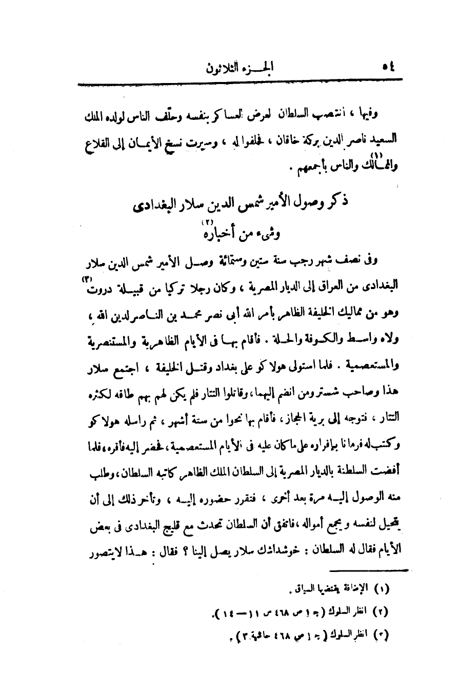 وفى نصف شهر رجب سنة ستين وستمائة وصل الأمير شمس الدين سلار البغدادى من العراق إلى الديار المصرية، وكان رجلا تركيا من قبيلة دروت «3» وهو من مماليك الخليفة الظاهر بأمر الله أبى نصر محمد بن الناصر لدين الله، ولاه واسط والكوفة والحلة. فأقام بها فى الأيام الظاهرية والمستنصرية والمستعصمية. فلما استولى هولاكو على بغداد وقتل الخليفة، اجتمع سلار هذا وصاحب شستر ومن انضم إليهما، وقاتلوا التتار فلم يكن لهم بهم طاقة لكثرة التتار، فتوجه إلى برية الحجاز، فأقام بها نحوا من سنة أشهر، ثم راسله هولاكو وكتب له فرمانا بإفراره على ما كان عليه فى الأيام المستعصمية، فحضر إليه فأقره، فلما أفضت السلطنة بالديار المصرية إلى السلطان الملك الظاهر كاتبه السلطان، وطلب منه الوصول إليه مرة بعد أخرى، فتقرر حضوره إليه، وتأخر ذلك إلى أن يتحيل لنفسه ويجمع أمواله، فاتفق أن السلطان تحدث مع قليج البغدادى فى بعض الأيام فقال له السلطان: خوشداشك سلار يصل إلينا؟ فقال: هذا لا يتصور