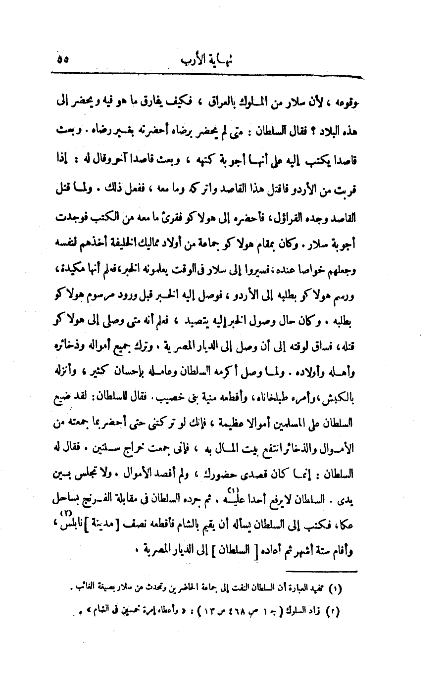وقوعه، لأن سلار من الملوك بالعراق، فكيف يفارق ما هو فيه ويحضر إلى هذه البلاد؟ فقال السلطان: متى لم يحضر برضاه أحضرته بغير رضاه. وبعث قاصدا يكتب إليه على أنها أجوبة كتبه، وبعث قاصدا آخر وقال له: إذا قربت من الأردو فاقتل هذا القاصد واتركه وما معه، ففعل ذلك. ولما قتل القاصد وجده القراؤل، فأحضره إلى هولاكو فقرىء ما معه من الكتب فوجدت أجوبة سلار. وكان بمقام هولاكو جماعة من أولاد مماليك الخليفة أخذهم لنفسه وجعلهم خواصا عنده، فسيروا إلى سلار فى الوقت يعلمونه الخبر، فعلم أنها مكيدة، ورسم هولاكو بطلبه إلى الأردو، فوصل إليه الخبر قبل ورود مرسوم هولاكو بطلبه. وكان حال وصول الخبر إليه يتصيد، فعلم أنه متى وصلى إلى هولاكو قتله، فساق لوقته إلى أن وصل إلى الديار المصرية. وترك جميع أمواله وذخائره وأهله وأولاده. ولما وصل أكرمه السلطان وعامله بإحسان كثير، وأنزله بالكبش، وأمره طبلخاناه، وأقطعه منية بنى خصيب. فقال للسلطان: لقد ضيع السلطان على المسلمين أموالا عظيمة، فإنك لو تركتنى حتى أحضر بما جمعته من الأموال والذخائر انتفع بيت المال به، فإنى جمعت خراج سنتين. فقال له السلطان: إنما كان قصدى حضورك، ولم أقصد الأموال. ولا تجلس بين يدى. السلطان لا يرفع أحدا عليه «1» . ثم جرده السلطان فى مقابلة الفرنج بساحل عكا، فكتب إلى السلطان يسأله أن يقيم بالشام فأقطعه نصف [مدينة] نابلس «2» ، وأقام ستة أشهر ثم أعاده [السلطان] إلى الديار المصرية.
