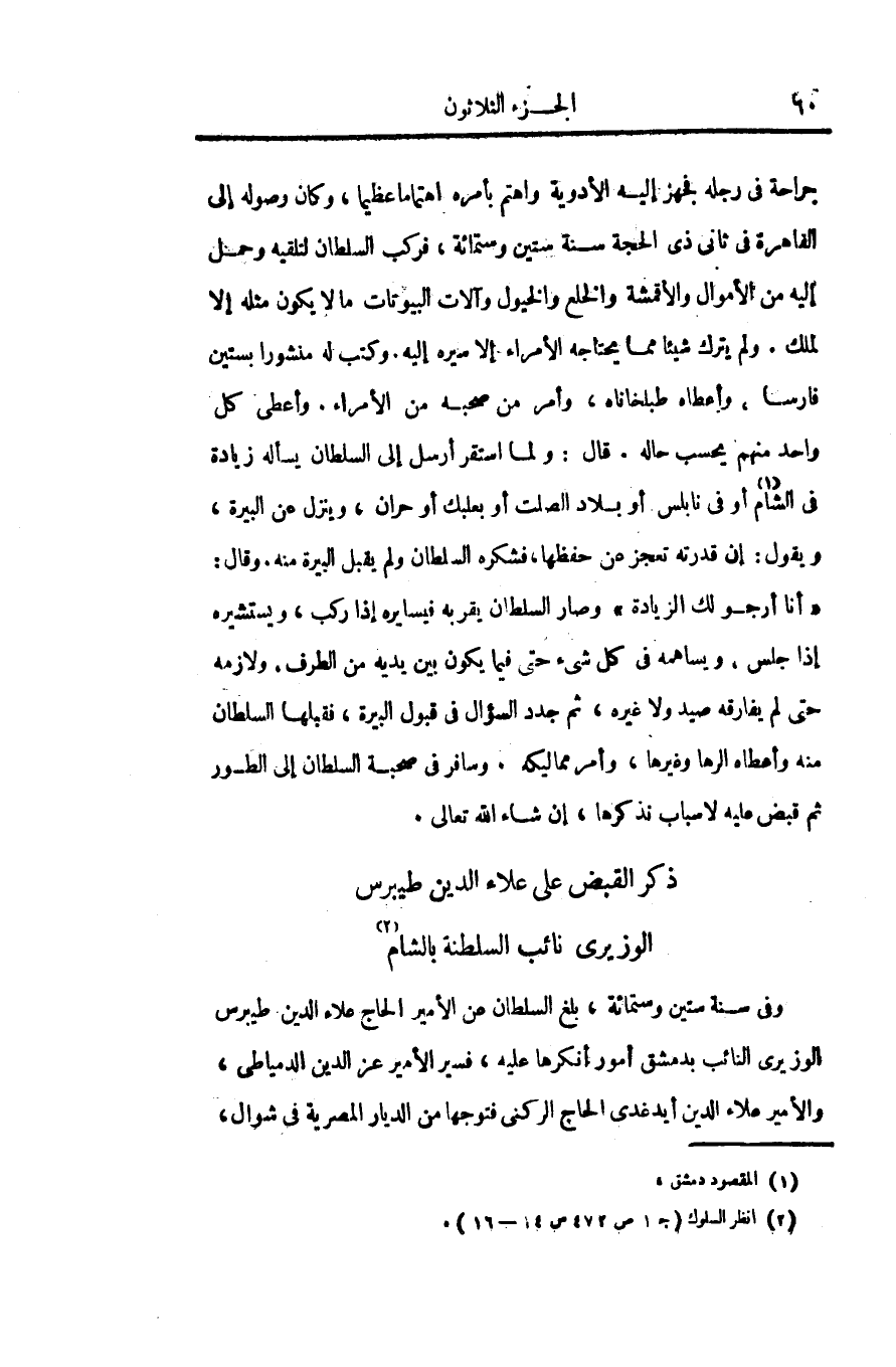 جراحة فى رجله فجهز إليه الأدوية واهتم بأمره اهتماما عظيما، وكان وصوله إلى القاهرة فى ثانى ذى الحجة سنة ستين وستمائة، فركب السلطان لتلقيه وحمل إليه من الأموال والأقمشة والخلع والخيول وآلات البيوتات ما لا يكون مثله إلا لملك. ولم يترك شيئا مما يحتاجه الأمراء إلا سيره إليه. وكتب له منشورا بستين فارسا، وأعطاه طبلخاناه، وأمر من صحبه من الأمراء. وأعطى كل واحد منهم يحسب حاله. قال: ولما استقر أرسل إلى السلطان يسأله زيادة فى الشام «1» أو فى نابلس أو بلاد الصلت أو بعلبك أو حران، وينزل عن البيرة، ويقول: إن قدرته تعجز عن حفظها، فشكره السلطان ولم يقبل البيرة منه. وقال: