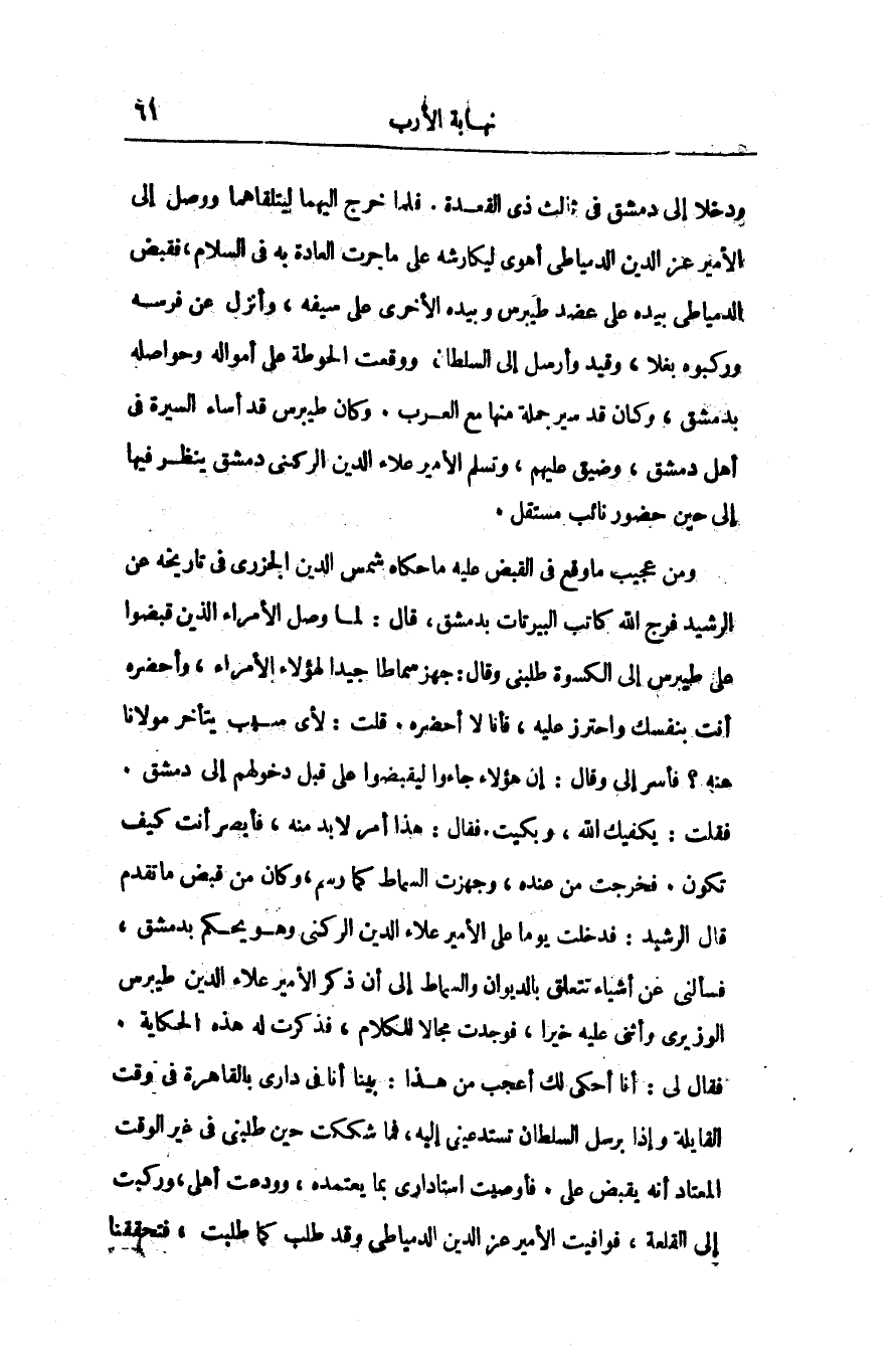 فقال لى: أنا أحكى لك أعجب من هذا: بينا أنا فى دارى بالقاهرة فى وقت القابلة وإذا برسل السلطان تستدعينى إليه، فما شككت حين طلبنى فى غير الوقت المعتاد أنه يقبض على. فأوصيت استادارى بما يعتمده، وودعت أهلى، وركبت إلى القلعة، فوافيت الأمير عز الدين الدمياطى وقد طلب كما طلبت، فتحققنا