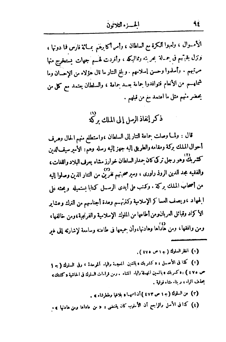 قال: ولما وصلت جماعة التتار إلى السلطان، واستطلع منهم الحال وعرف أحوال الملك بركة ومقامه والطريق إليه جهز إليه رسله وهم: الأمير سيف الدين كشربك «2» وهو رجل تركى كان جمدار السلطان خوارزمشاه يعرف البلاد واللغات، والفقيه مجد الدين الروذ راورى، وسير صحبتهم نفرين «3» من التتار الذين وصلوا إليه من أصحاب الملك بركة. وكتب على أيدى الرسل كتابا بستميله ويحثه على الجهاد، ويصف العساكر الإسلامية وكثرتهم وعدة أجناسهم من الترك وعشاير الأكراد وقبائل العربان ومن أطاعها من الملوك الإسلامية والفرنجية، ومن خالفها، ومن وافقها، ومن هاداها «4» وهادنها، وأن جميعها فى طاعته وسامعة لإشارته إلى غير