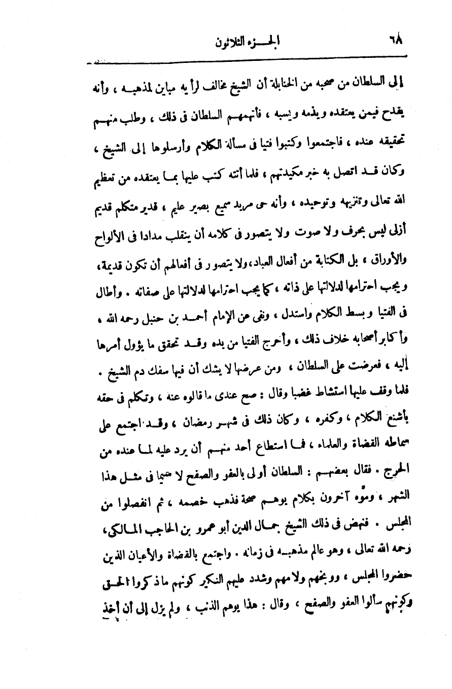 إلى السلطان من صحبه من الحنابلة أن الشيخ مخالف لرأيه مباين لمذهبه، وأنه يقدح فيمن يعتقده ويذمه ويسبه، فأتهمهم السلطان فى ذلك، وطلب منهم تحقيقه عنده، فاجتمعوا وكتبوا فتيا فى مسألة الكلام وأرسلوها إلى الشيخ، وكان قد اتصل به خبر مكيدتهم، فلما أتته كتب عليها بما يعتقده من تعظيم الله تعالى وتنزيهه وتوحيده، وأنه حى مريد سميع بصير عليم، قدير متكلم قديم أزلى ليس بحرف ولا صوت ولا يتصور فى كلامه أن ينقلب مدادا فى الألواح والأوراق، بل الكتابة من أفعال العباد، ولا يتصور فى أفعالهم أن تكون قديمة، ويجب احترامها لدلالتها على ذاته، كما يجب احترامها لدلالتها على صفاته. وأطال فى الفتيا وبسط الكلام واستدل، ونفى عن الإمام أحمد بن حنبل رحمه الله، وأكابر أصحابه خلاف ذلك، وأخرج الفتيا من يده وقد تحقق ما يؤول أمرها إليه، فعرضت على السلطان، ومن عرضها لا يشك أن فيها سفك دم الشيخ.