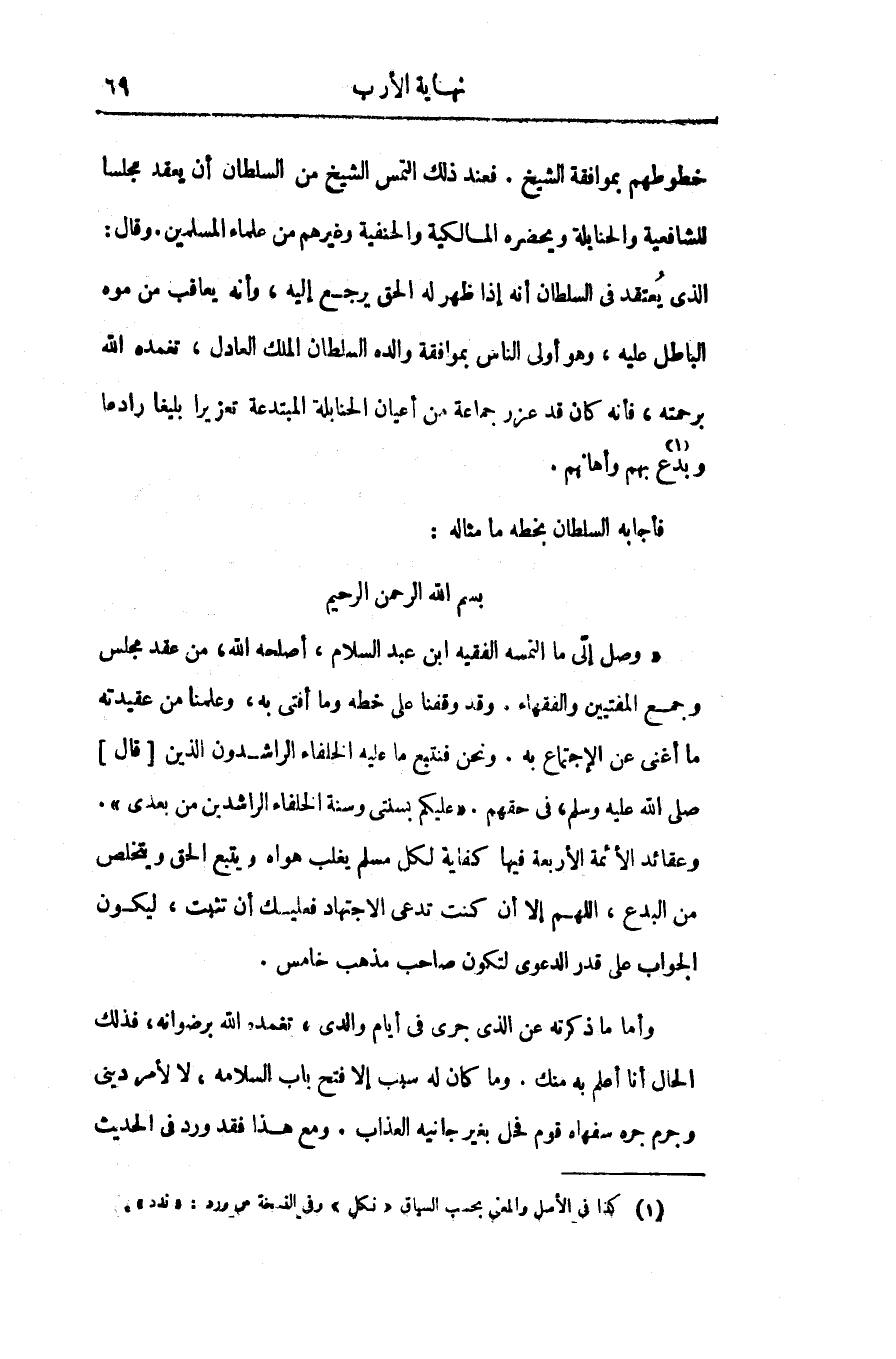 «وصل إلىّ ما التمسه الفقيه ابن عبد السلام، أصلحه الله، من عقد مجلس وجمع المفتيين والفقهاء. وقد وقفنا على خطه وما أفتى به، وعلمنا من عقيدته ما أغنى عن الإجتماع به. ونحن فنتبع ما عليه الخلفاء الراشدون الذين [قال] صلّى الله عليه وسلّم، فى حقهم. «عليكم بسنتى وسنة الخلفاء الراشدين من بعدى» .