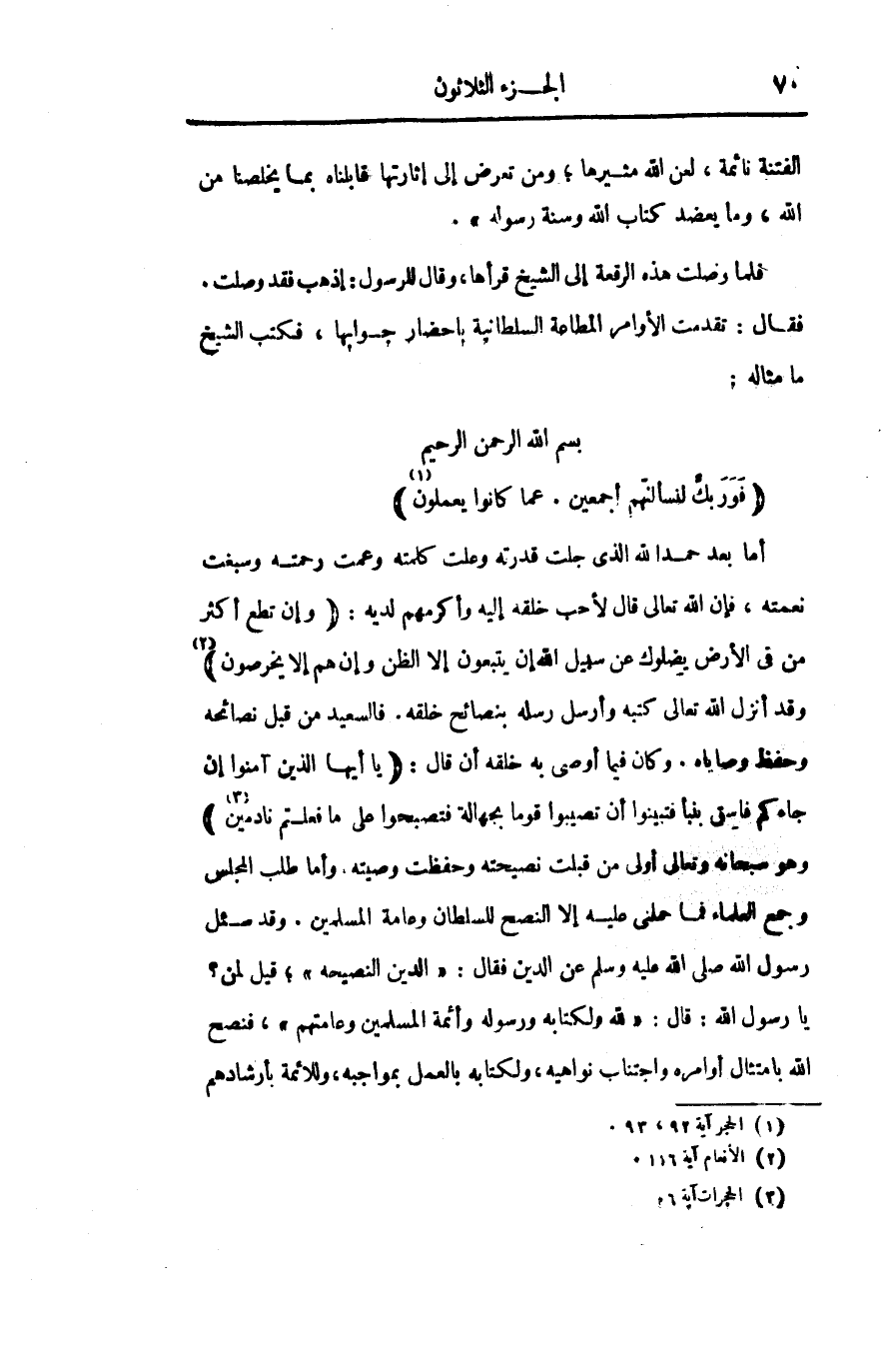 «3» وهو سبحانه وتعالى أولى من قبلت نصيحته وحفظت وصيته. وأما طلب المجلس وجمع العلماء فما حملنى عليه إلا النصح للسلطان وعامة المسلمين. وقد سئل رسول الله صلى الله عليه وسلم عن الدين فقال: «الدين النصيحه» ؛ قيل لمن؟
