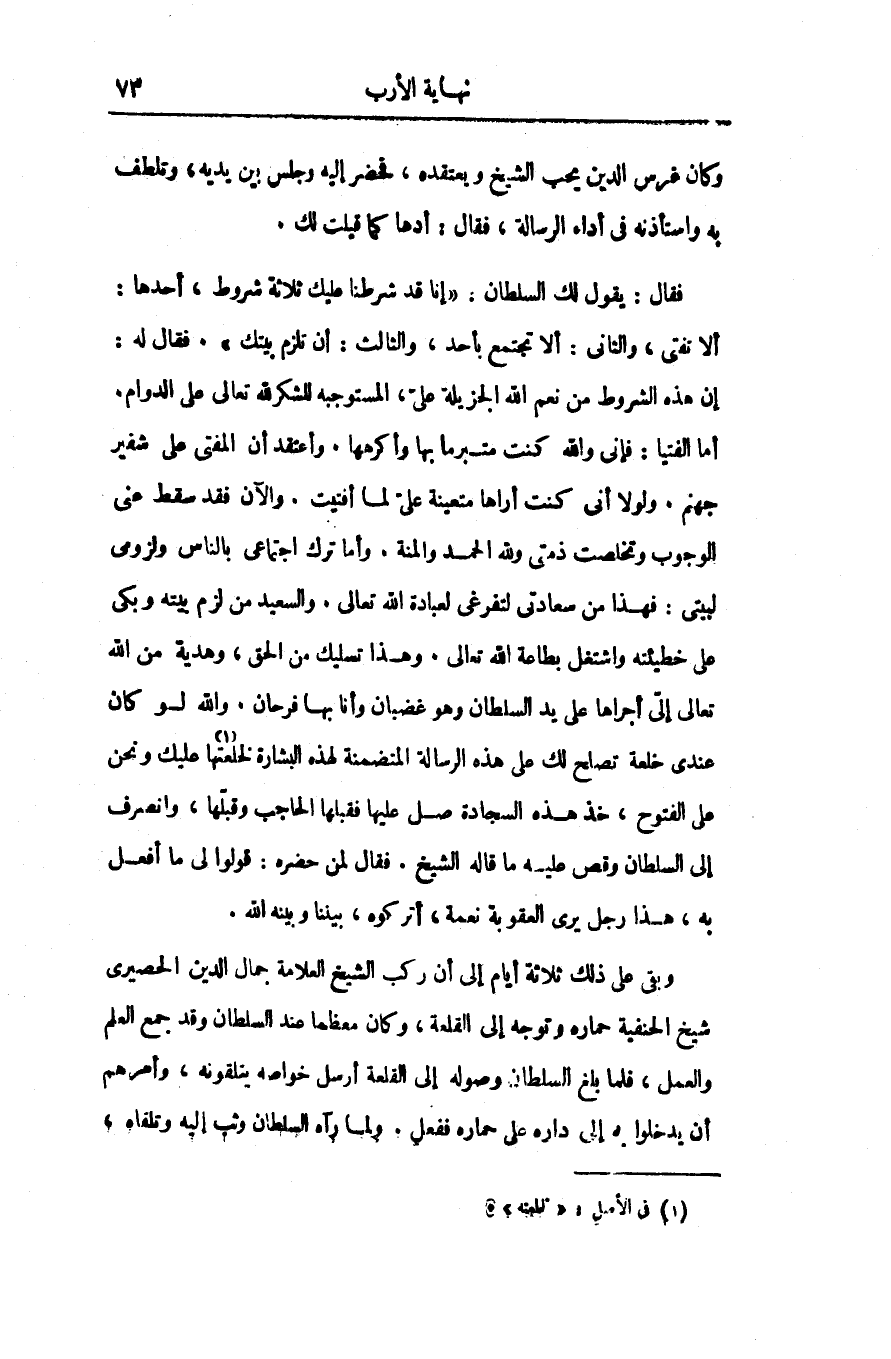 فقال: يقول لك السلطان: «إنا قد شرطنا عليك ثلاثة شروط، أحدها: