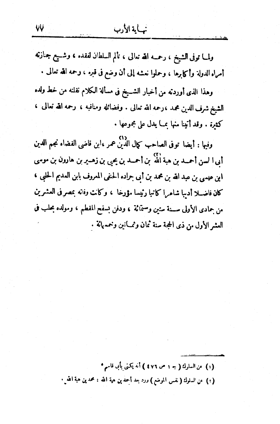 وهذا الذى أوردته من أخبار الشيخ فى مسألة الكلام نقلته من خط ولده الشيخ شرف الدين محمد، رحمه الله تعالى. وفضائله ومناقبه، رحمه الله تعالى، كثيرة. وقد أتينا منها بما يدل على مجموعها.