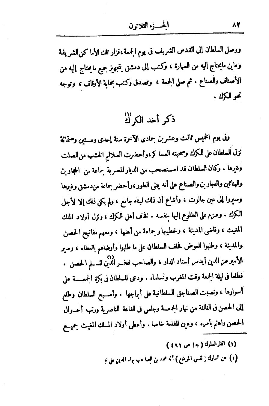 وفى يوم الخميس ثالث وعشرين جمادى الآخرة سنة إحدى وستين وستمائة نزل السلطان على الكرك وصحبته العساكر، وأحضرت السلاليم الخشب من الصلت وغيرها. وكان السلطان قد استصحب من الديار المصرية جماعة من الحجارين والبنائين والنجارين والصناع على أنه يبتى الطور، وأحضر جماعة من دمشق وغيرها وسيروا إلى عين جالوت، وأشاع أن ذلك لبناء جامع، ولم يكن ذلك إلا لأجل الكرك. وعزم على الطلوع إليها بنفسه. فخاف أهل الكرك، ونزل أولاد الملك المغيث، وقاضى المدينة، وخطيبها وجماعة من أهلها، ومعهم مفاتيح الحصن والمدينة، وطلبوا العوض فحلف السلطان على ما طلبوا وأرضاهم بالعطاء، وسير الأمير عز الدين أيدمر أستاد الدار، والصاحب فخر الدين «2» لتسلم الحصن.