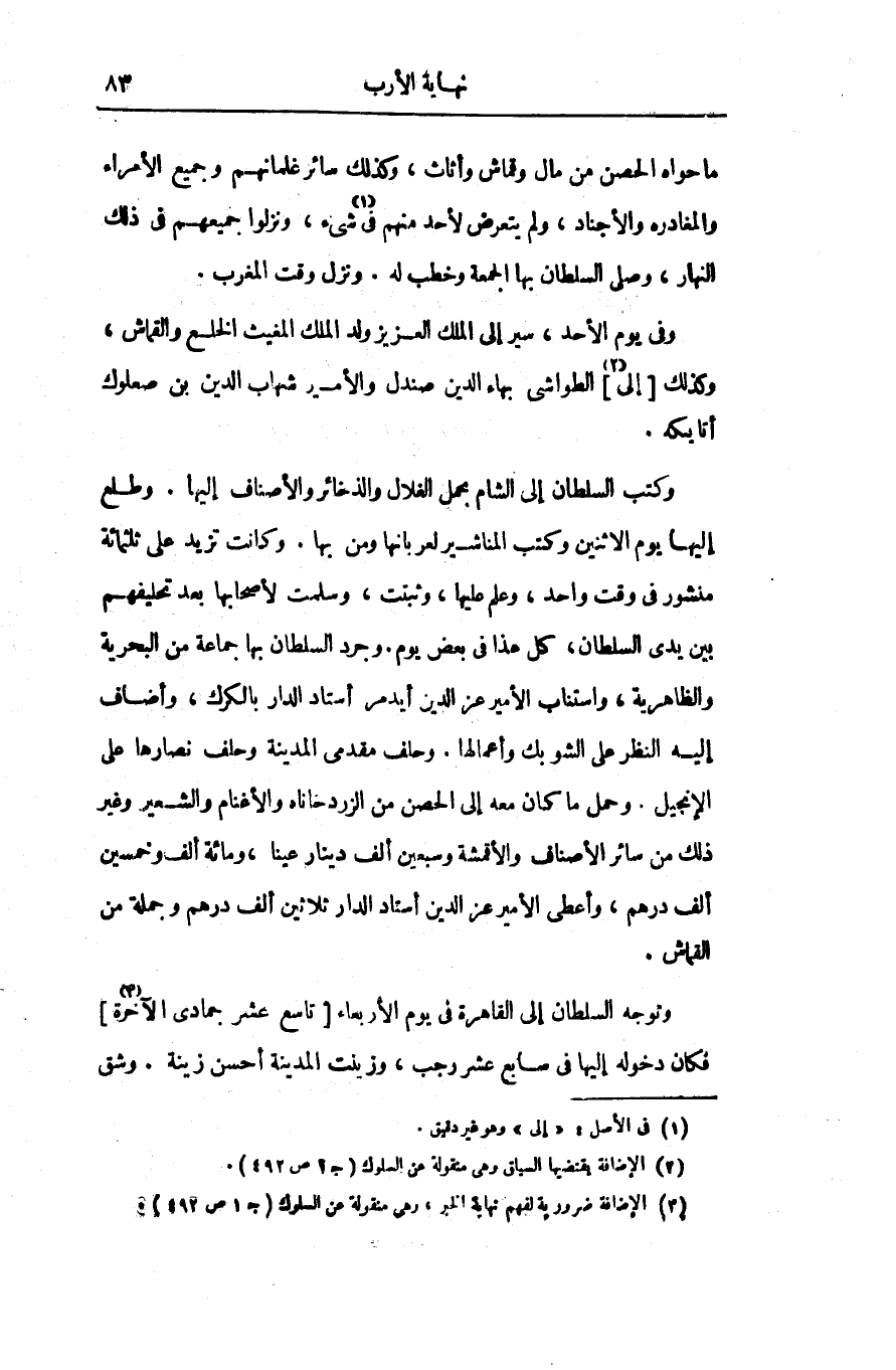 ما حواه الحصن من مال وقماش وأثاث، وكذلك سائر غلمانهم وجميع الأمراء والمغادره والأجناد، ولم يتعرض لأحد منهم فى «1» شىء، ونزلوا جميعهم فى ذلك النهار، وصلى السلطان بها الجمعة وخطب له. ونزل وقت المغرب.