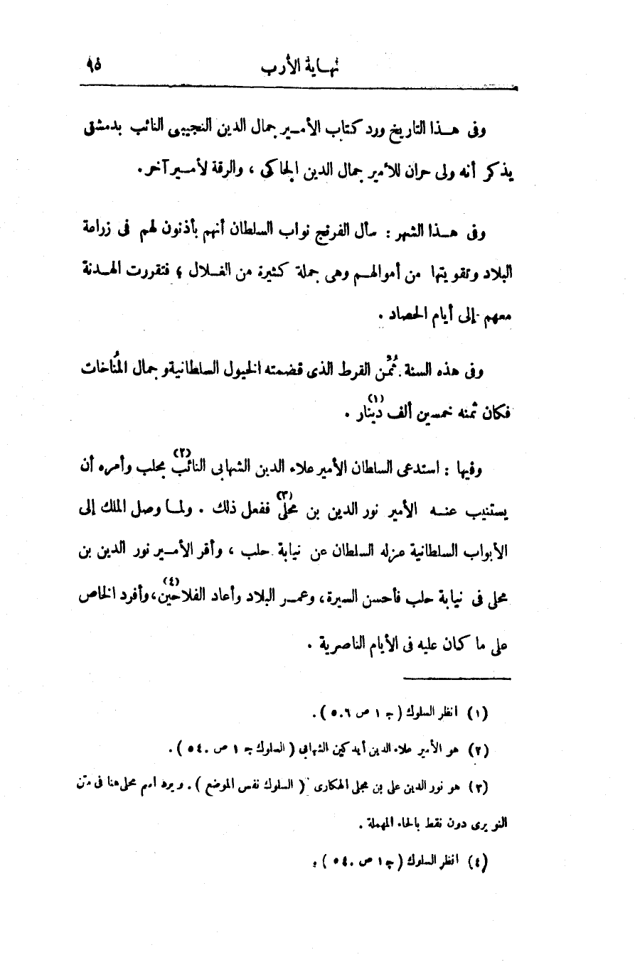 وفيها: استدعى السلطان الأمير علاء الدين الشهابى النائب «2» بحلب وأمره أن يستنيب عنه الأمير نور الدين بن محلى «3» ففعل ذلك. ولما وصل الملك إلى الأبواب السلطانية عزله السلطان عن نيابة حلب، وأقر الأمير نور الدين بن محلى فى نيابة حلب فأحسن السيرة، وعمر البلاد وأعاد الفلاحين «4» ، وأفرد الخاص على ما كان عليه فى الأيام الناصرية.
