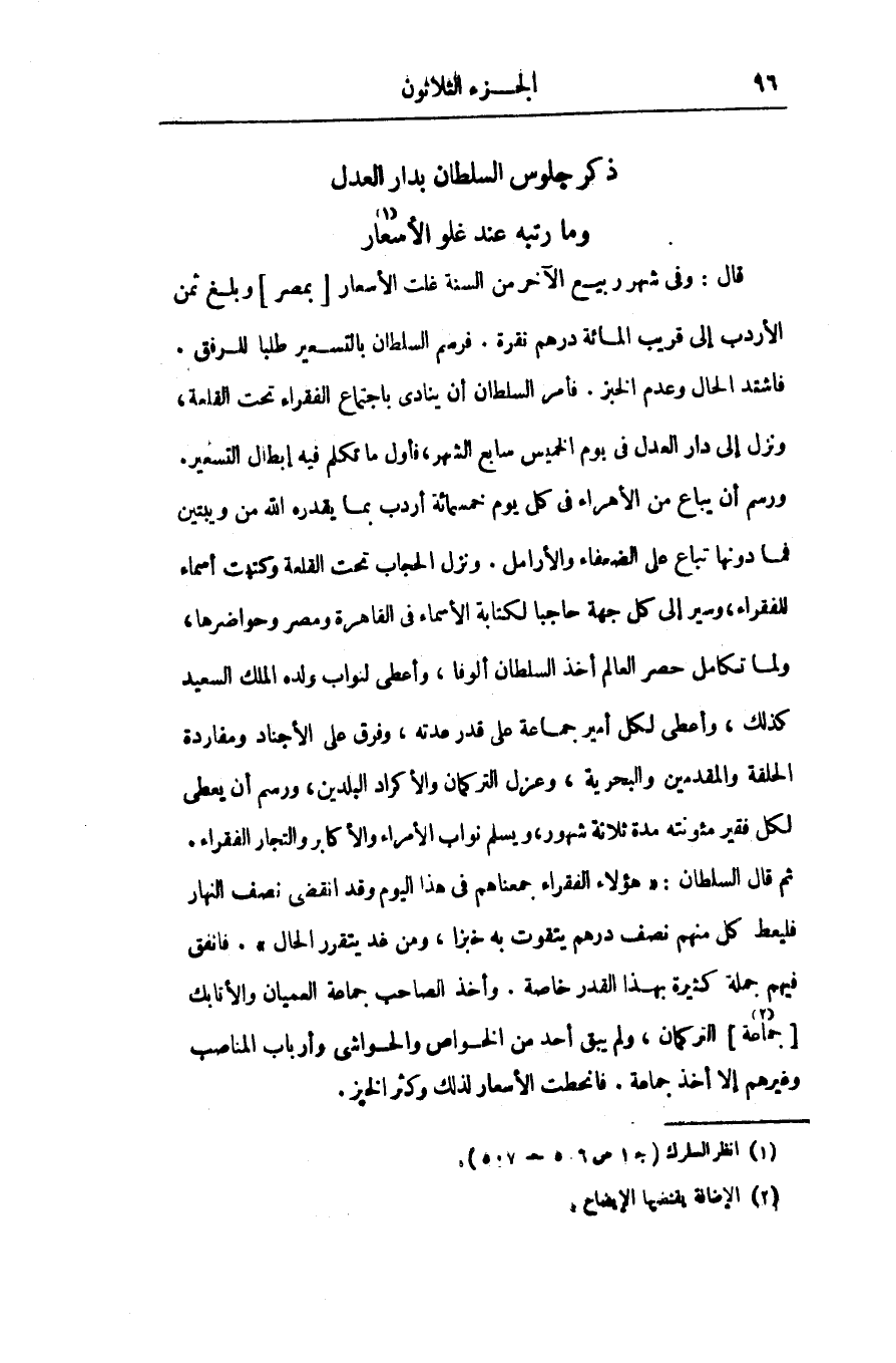 فاشتد الحال وعدم الخبز. فأمر السلطان أن ينادى باجتماع الفقراء تحت القلعة، ونزل إلى دار العدل فى يوم الخميس سابع الشهر، فأول ما تكلم فيه إبطال التسعير.