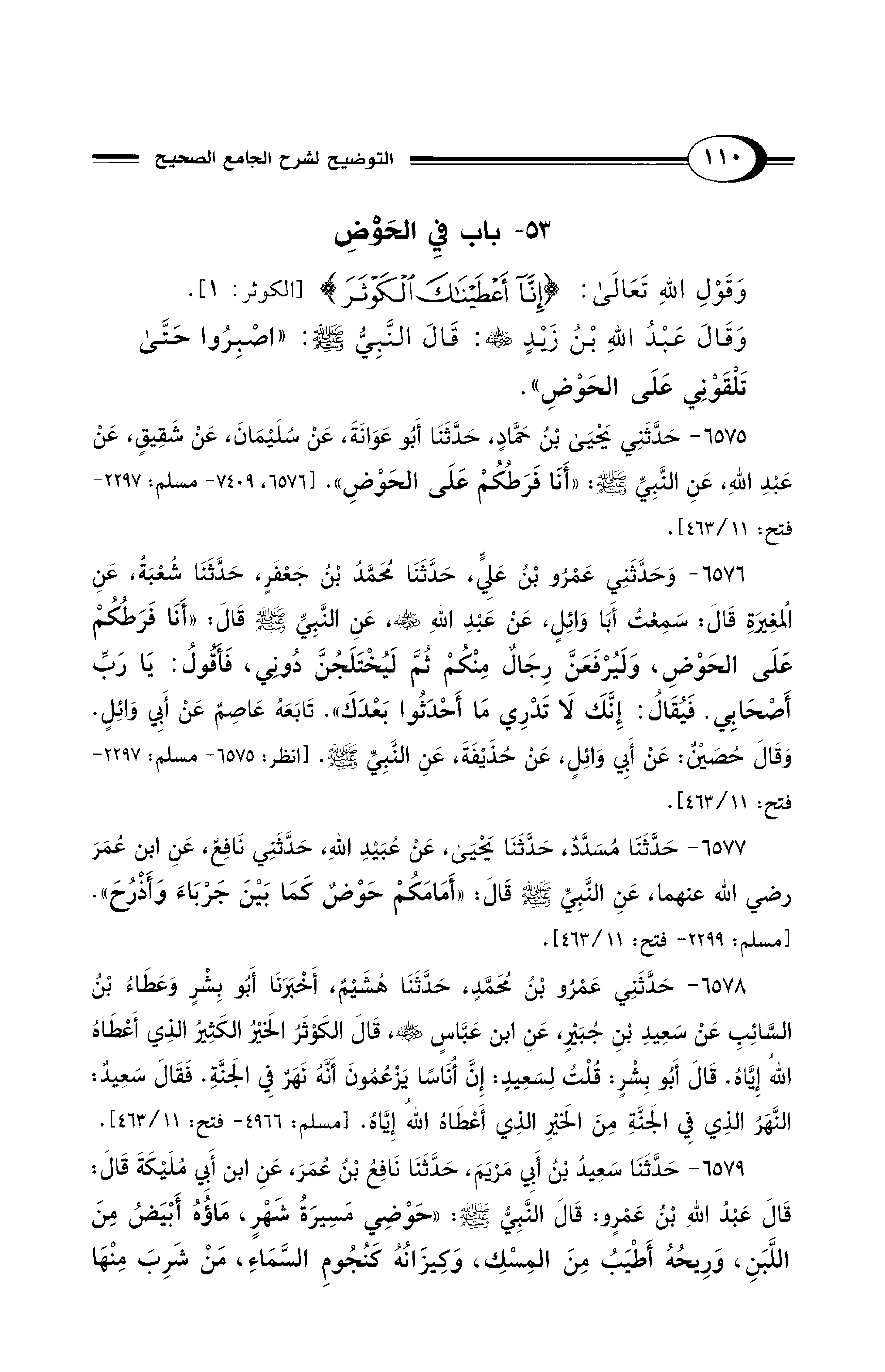 6575 - حَدَّثَنِي يَحْيَى بْنُ حَمَّادٍ، حَدَّثَنَا أَبُو عَوَانَةَ، عَنْ سُلَيْمَانَ، عَنْ شَقِيقٍ، عَنْ عَبْدِ اللهِ، عَنِ النَّبِيِّ - صلى الله عليه وسلم -: «أَنَا فَرَطُكُمْ عَلَى الْحَوْضِ» [6576، 7409 - مسلم: 2297 - فتح: 11/ 463].
