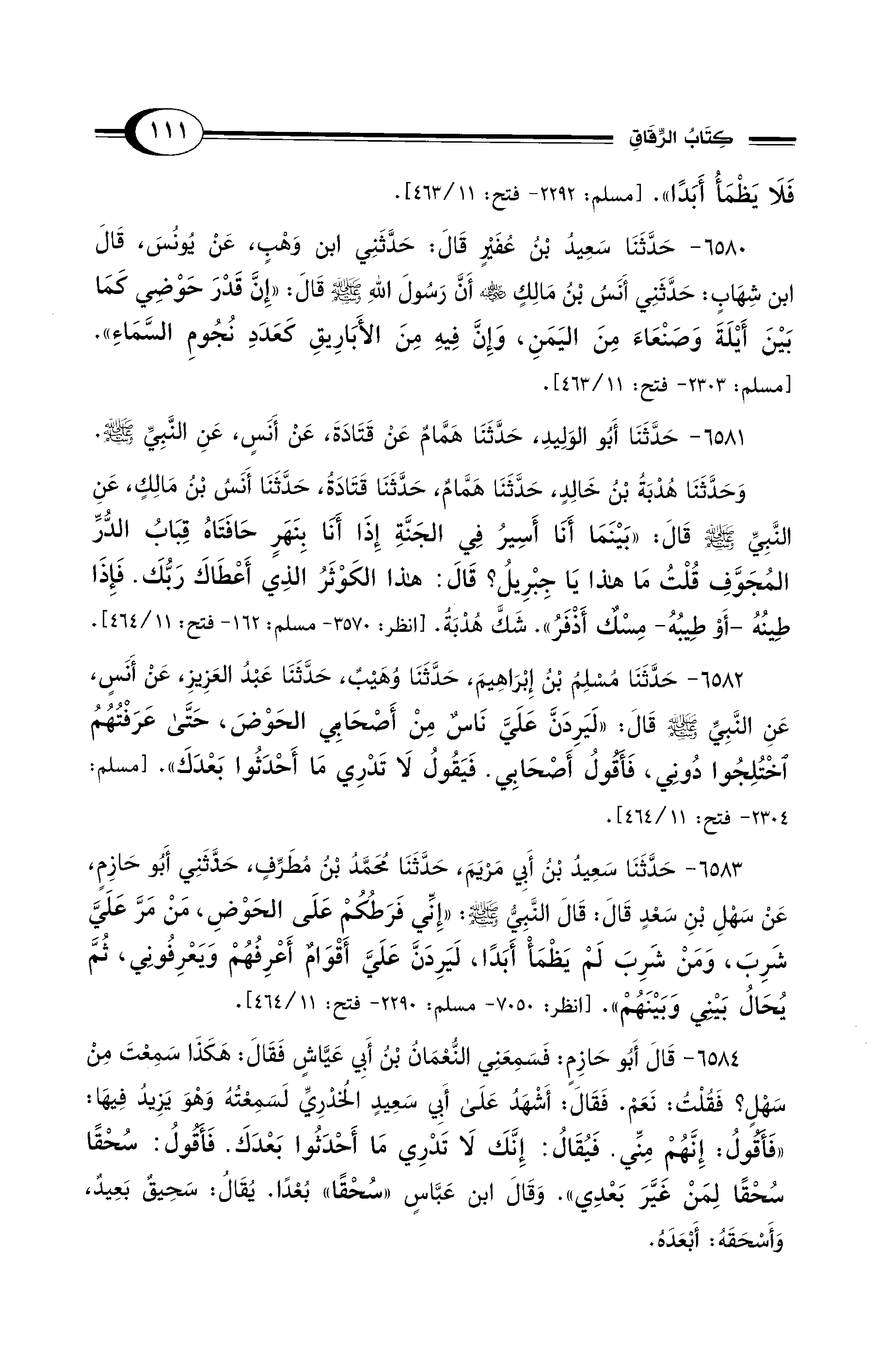 6580 - حَدَّثَنَا سَعِيدُ بْنُ عُفَيْرٍ قَالَ: حَدَّثَنِي ابْنُ وَهْبٍ، عَنْ يُونُسَ، قَالَ ابْنُ شِهَابٍ: حَدَّثَنِي أَنَسُ بْنُ مَالِكٍ - رضي الله عنه - أَنَّ رَسُولَ اللهِ - صلى الله عليه وسلم - قَالَ: «إِنَّ قَدْرَ حَوْضِي كَمَا بَيْنَ أَيْلَةَ وَصَنْعَاءَ مِنَ الْيَمَنِ، وَإِنَّ فِيهِ مِنَ الأَبَارِيقِ كَعَدَدِ نُجُومِ السَّمَاءِ». [مسلم: 2303 - فتح: 11/ 463].