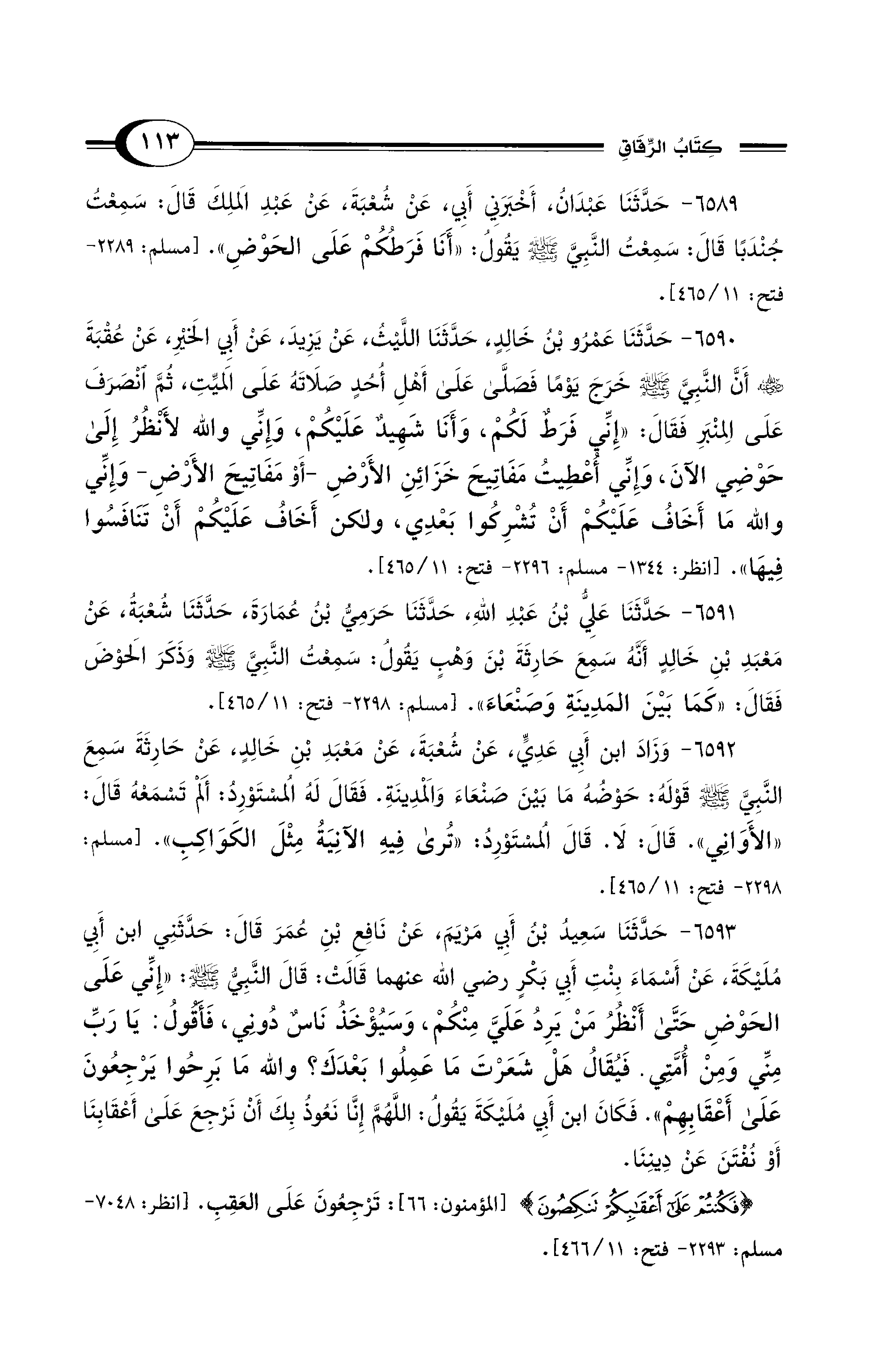 6589 - حَدَّثَنَا عَبْدَانُ، أَخْبَرَنِي أَبِي عَنْ شُعْبَةَ، عَنْ عَبْدِ الْمَلِكَ قَالَ: سَمِعْتُ جُنْدَبًا قَالَ: سَمِعْتُ النَّبِيَّ - صلى الله عليه وسلم - يَقُولُ: «أَنَا فَرَطُكُمْ عَلَى الْحَوْضِ» [مسلم: 2289 - فتح: 11/ 465].