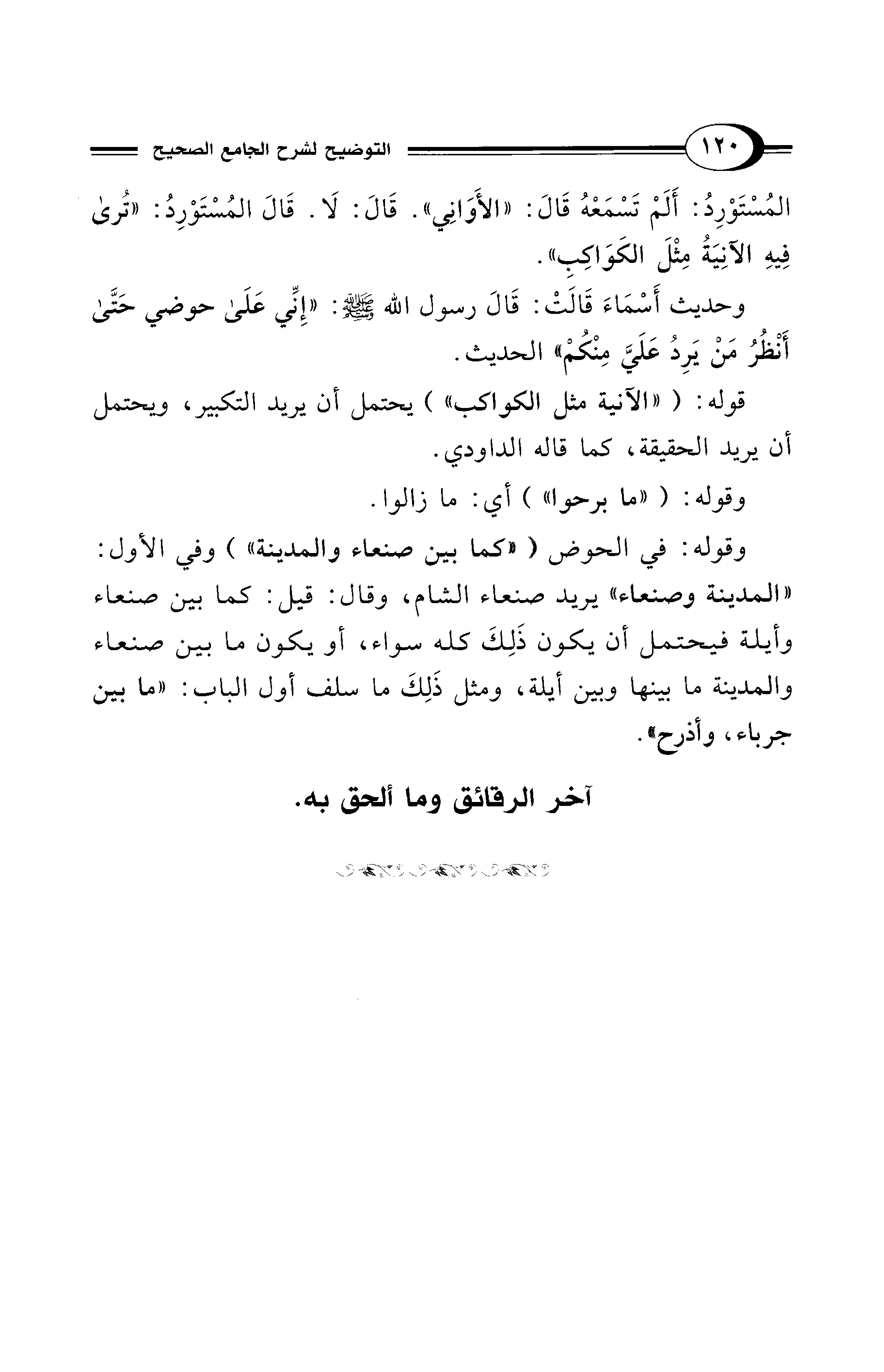 وحديث أَسْمَاءَ قَالَتْ: قَالَ رسول الله - صلى الله عليه وسلم -: "إِنِّي عَلَى حوضي حَتَّى أَنْظُرُ مَنْ يَرِدُ عَلَيَّ مِنْكُمْ" الحديث.