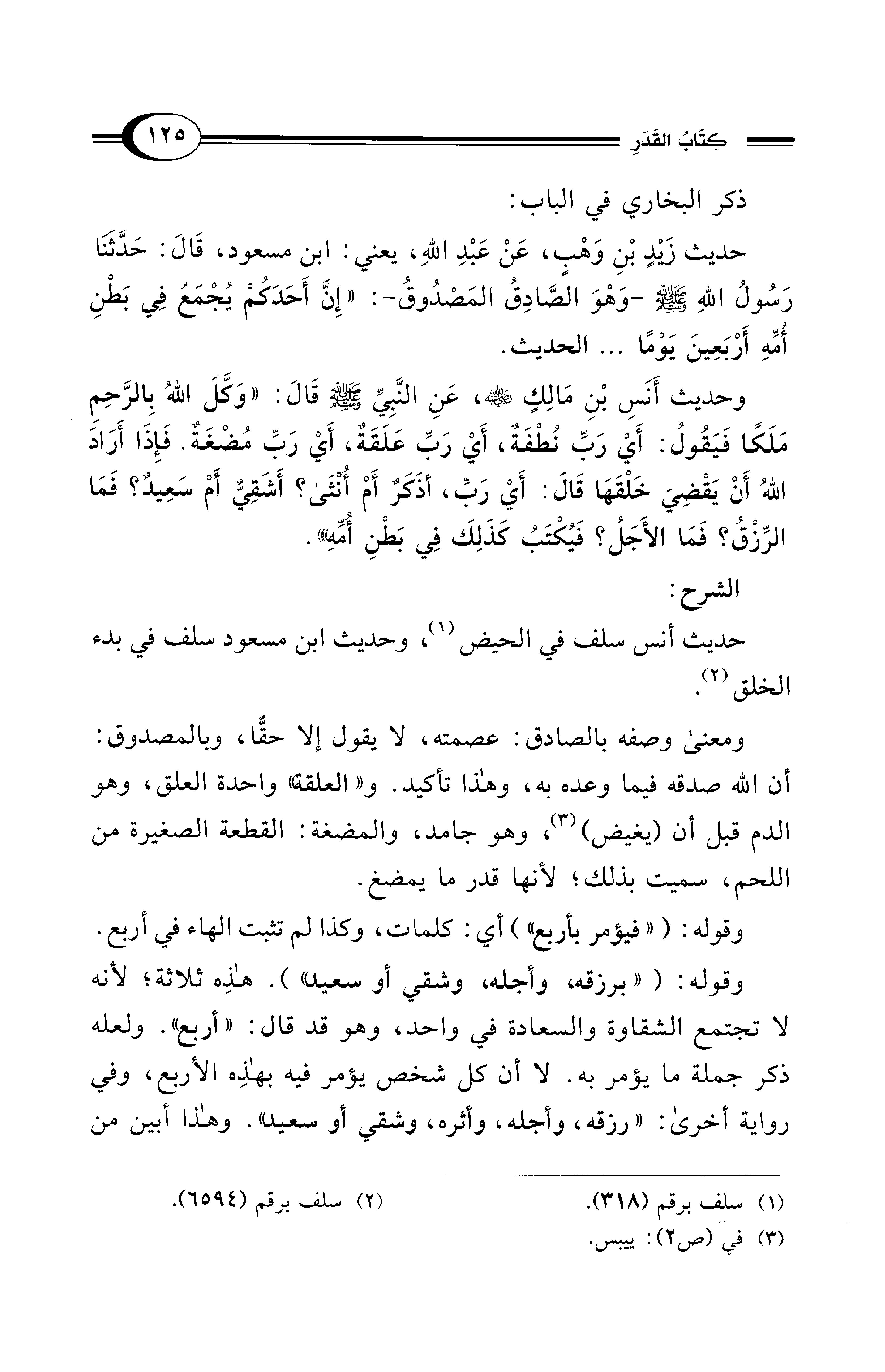 حديث زَيْدٍ بْنِ وَهْبٍ، عَنْ عَبْدِ اللهِ، يعني: ابن مسعود، قَالَ: حَدَّثَنَا رَسُولُ اللهِ - صلى الله عليه وسلم -وَهْوَ الصَّادِقُ المَصْدُوقُ-: "إِنَّ أَحَدَكُمْ يُجْمَعُ فِي بَطْنِ أُمِّهِ أَرْبَعِينَ يَوْمًا ... الحديث.