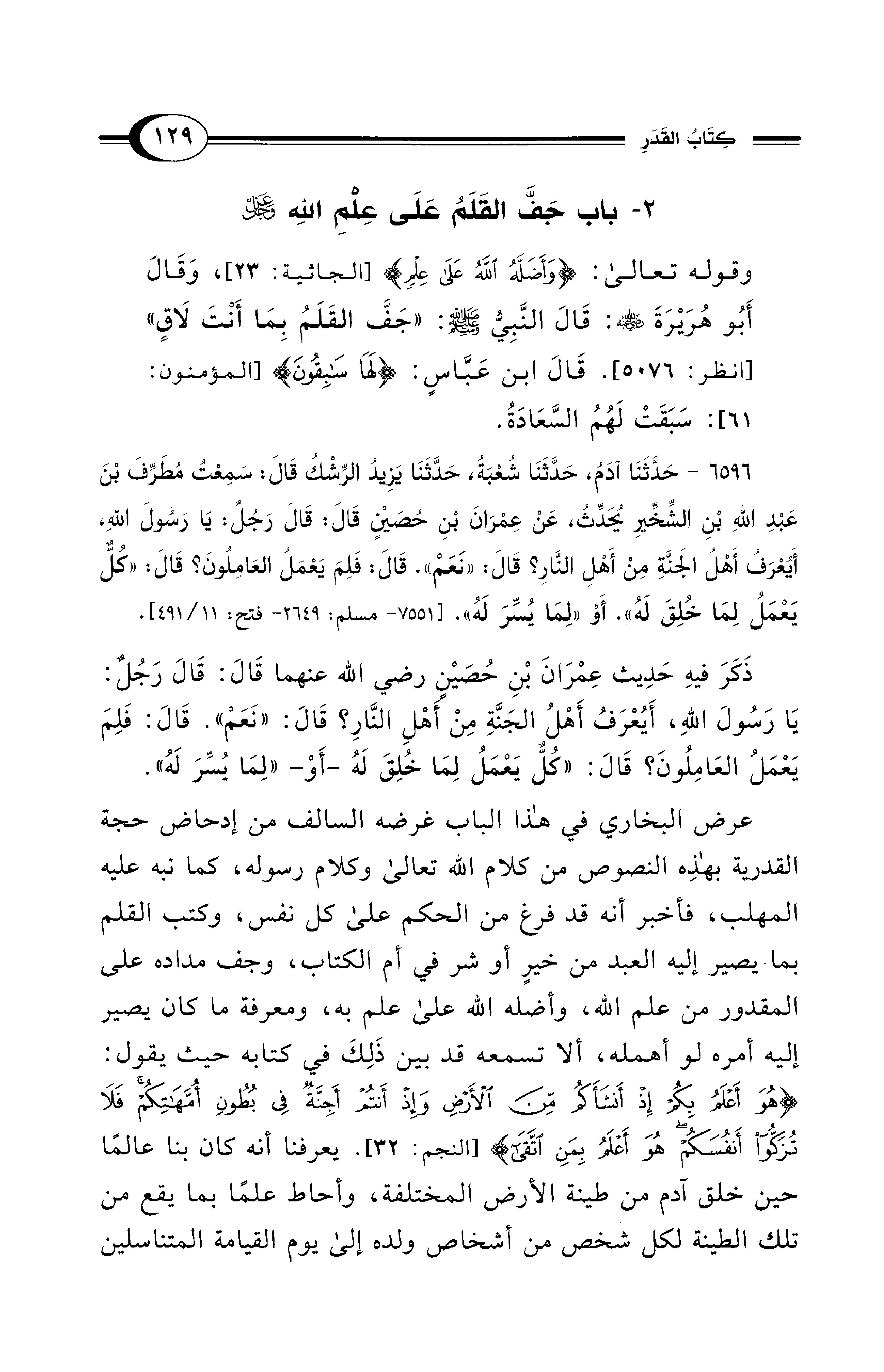 ذَكَرَ فيهِ حَدِيث عِمْرَانَ بْنِ حُصَيْنٍ - رضي الله عنهما - قَالَ: قَالَ رَجُلٌ: يَا رَسُولَ اللهِ، أَيُعْرَفُ أَهْلُ الجَنَّةِ مِنْ أهْلِ النَّارِ؟ قَالَ: "نَعَمْ". قَالَ: فَلِمَ يَعْمَلُ العَامِلُونَ؛ قَالَ: "كُلٌّ يَعْمَلُ لِمَا خُلِقَ لَهُ -أَوْ- "لِمَا يُسِّرَ لَهُ".