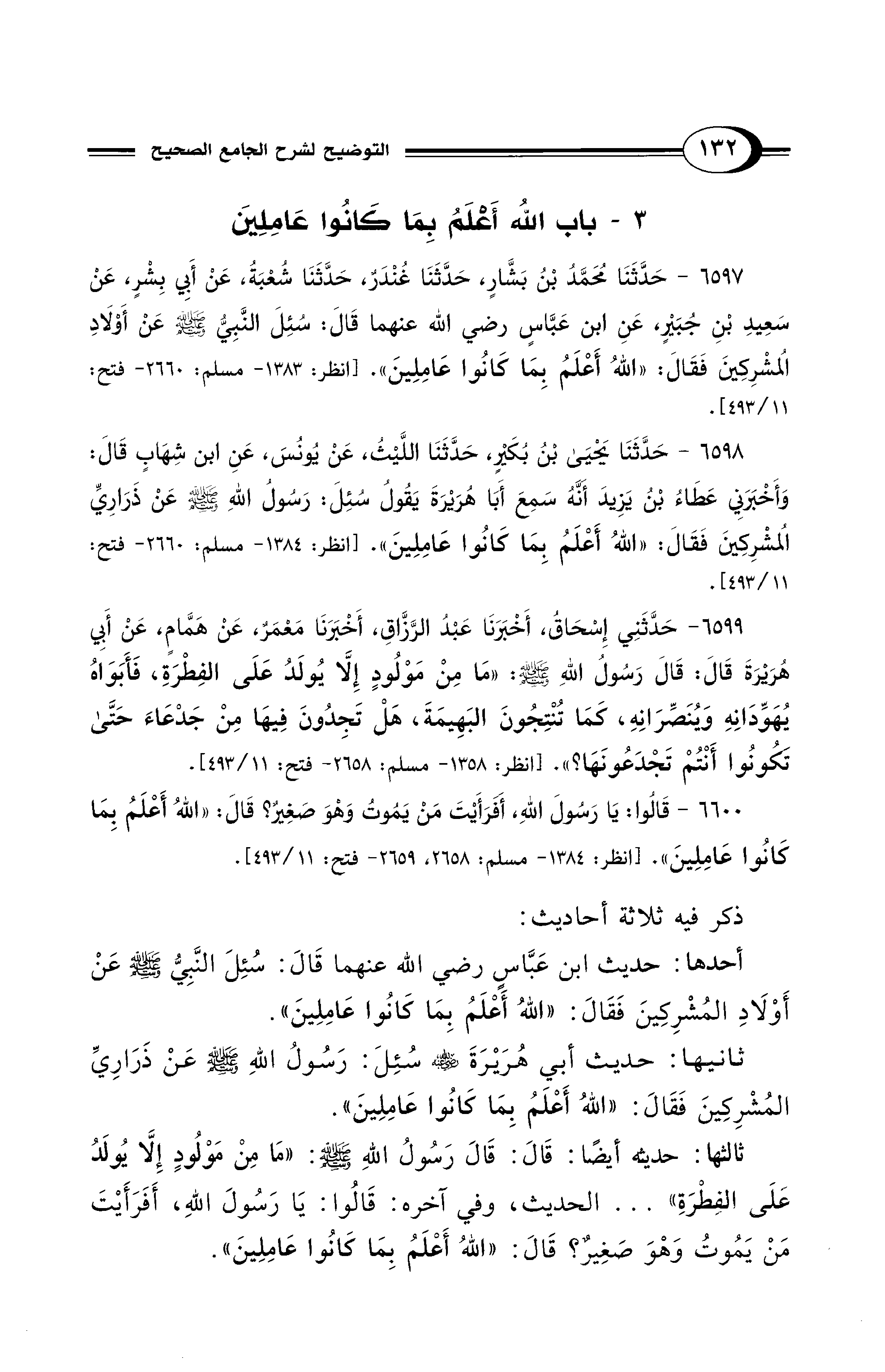 6597 - حَدَّثَنَا مُحَمَّدُ بْنُ بَشَّارٍ، حَدَّثَنَا غُنْدَرٌ، حَدَّثَنَا شُعْبَةُ، عَنْ أَبِي بِشْرٍ، عَنْ سَعِيدِ بْنِ جُبَيْرٍ عَنِ ابْنِ عَبَّاسٍ - رضي الله عنهما - قَالَ سُئِلَ النَّبِيُّ - صلى الله عليه وسلم - عَنْ أَوْلاَدِ الْمُشْرِكِينَ فَقَالَ: «اللهُ أَعْلَمُ بِمَا كَانُوا عَامِلِينَ» [انظر: 1383 - مسلم: 2660 - فتح: 11/ 493].