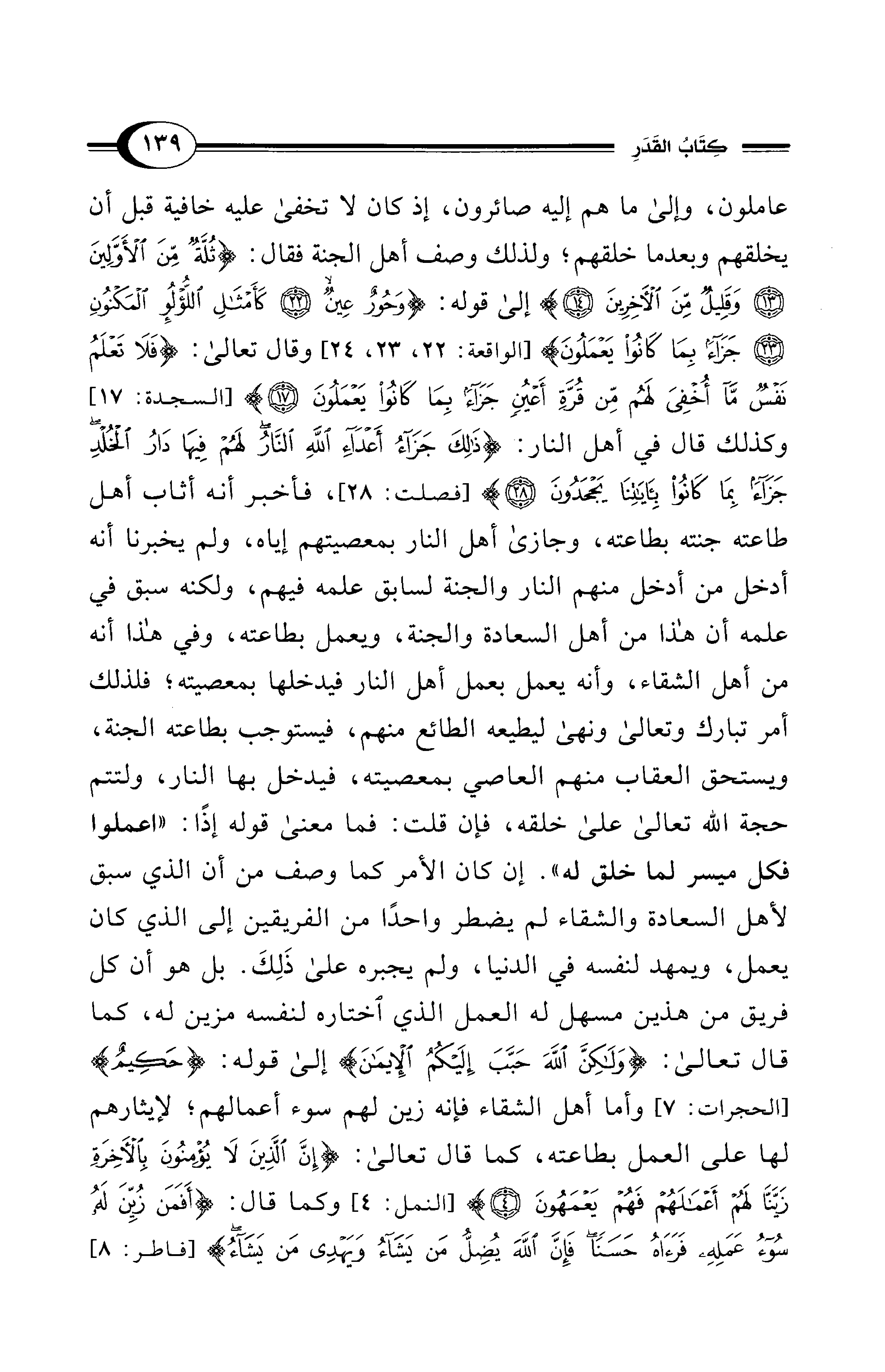 عاملون، وإلى ما هم إليه صائرون، إذ كان لا تخفى عليه خافية قبل أن يخلقهم وبعدما خلقهم؛ ولذلك وصف أهل الجنة فقال: {ثُلَّةٌ مِنَ الْأَوَّلِينَ (13) وَقَلِيلٌ مِنَ الْآخِرِينَ (14)} إلى قوله: {وَحُورٌ عِينٌ (22) كَأَمْثَالِ اللُّؤْلُؤِ الْمَكْنُونِ (23) جَزَاءً بِمَا كَانُوا يَعْمَلُونَ} [الواقعة: 22, 23، 24]، وقال تعالى: {فَلَا تَعْلَمُ نَفْسٌ مَا أُخْفِيَ لَهُمْ مِنْ قُرَّةِ أَعْيُنٍ جَزَاءً بِمَا كَانُوا يَعْمَلُونَ (17)} [السجدة: 17] وكذلك قال في أهل النار: {ذَلِكَ جَزَاءُ أَعْدَاءِ اللهِ النَّارُ لَهُمْ فِيهَا دَارُ الْخُلْدِ جَزَاءً بِمَا كَانُوا بِآيَاتِنَا يَجْحَدُونَ (28)} [فصلت: 28]، فأخبر أنه أثاب أهل طاعته جنته بطاعته، وجازى أهل النار بمعصيتهم إياه، ولم يخبرنا أنه أدخل من أدخل منهم النار والجنة لسابق علمه فيهم، ولكنه سبق في علمه أن هذا من أهل السعادة والجنة، ويعمل بطاعته، وفي هذا أنه من أهل الشقاء، وأنه يعمل بعمل أهل النار فيدخلها بمعصيته؛ فلذلك أمر تبارك وتعالى ونهى ليطيعه الطائع منهم، فيستوجب بطاعته الجنة، ويستحق العقاب منهم العاصي بمعصيته، فيدخل بها النار، ولتتم حجة الله تعالى على خلقه، فإن قلت: فما معنى قوله إذًا: "اعملوا فكل ميسر لما خلق له". إن كان الأمر كما وصف من أن الذي سبق لأهل السعادة والشقاء لم يضطر واحداً من الفريقين إلى الذي كان يعمل، ويمهد لنفسه في الدنيا، ولم يجبره على ذَلِكَ. بل هو أن كل فريق من هذين مسهل له العمل الذي اختاره لنفسه مزين له، كما قال تعالى: {وَلَكِنَّ اللهَ حَبَّبَ إِلَيْكُمُ الْإِيمَانَ} إلى قوله: {حَكِيمٌ} [الحجرات: 7]، وأما أهل الشقاء فإنه زين لهم سوء أعمالهم؛ لإيثارهم لها على العمل بطاعته، كما قال تعالى: {إِنَّ الَّذِينَ لَا يُؤْمِنُونَ بِالْآخِرَةِ