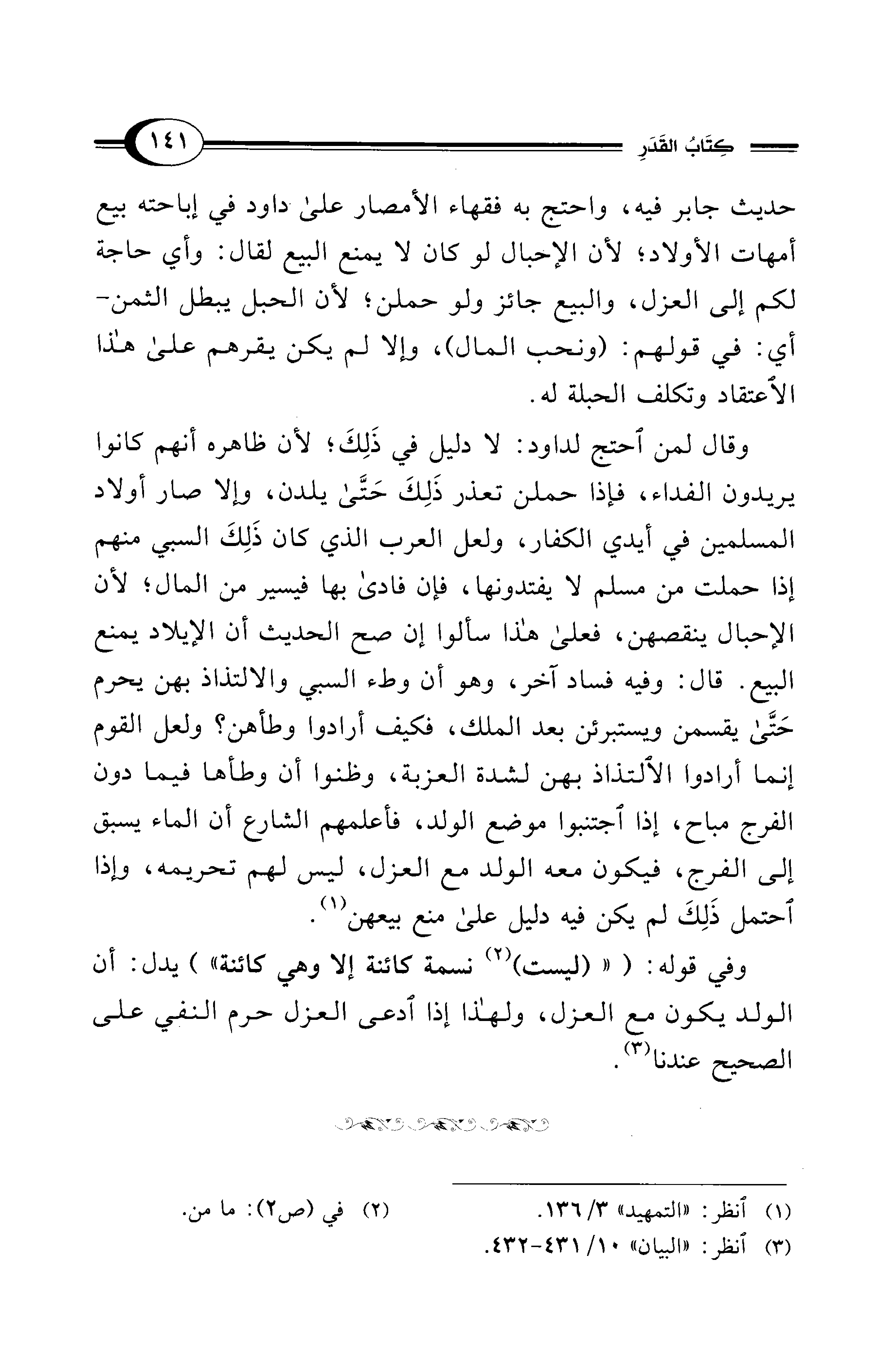 حديث جابر فيه، واحتج به فقهاء الأمصار على داود في إباحته بيع أمهات الأولاد؛ لأن الإحبال لو كان لا يمنع البيع لقال: وأي حاجة لكم إلى العزل، والبيع جائز ولو حملن؛ لأن الحبل يبطل الثمن- أي: في قولهم: (ونحب المال)، وإلا لم يكن يقرهم على هذا الاعتقاد وتكلف الحبلة له.
