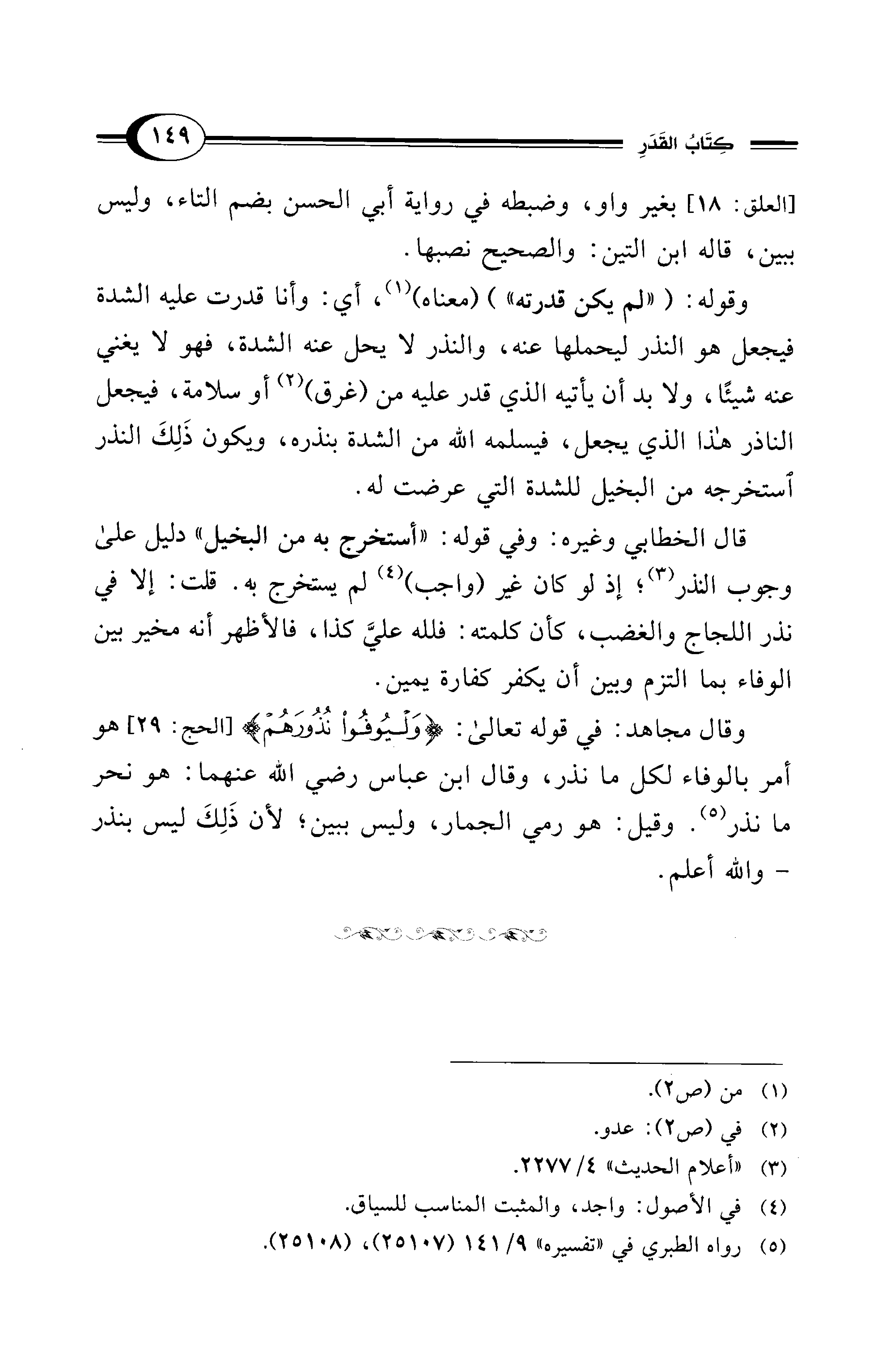 وقال مجاهد: في قوله تعالى: {وَلْيُوفُوا نُذُورَهُمْ} [الحج: 29] هو أمر بالوفاء لكل ما نذر، وقال ابن عباس - رضي الله عنهما -: هو نحو ما نذر (¬5). وقيل: هو رمي الجمار، وليس ببين؛ لأن ذَلِكَ ليس بنذر - والله أعلم.