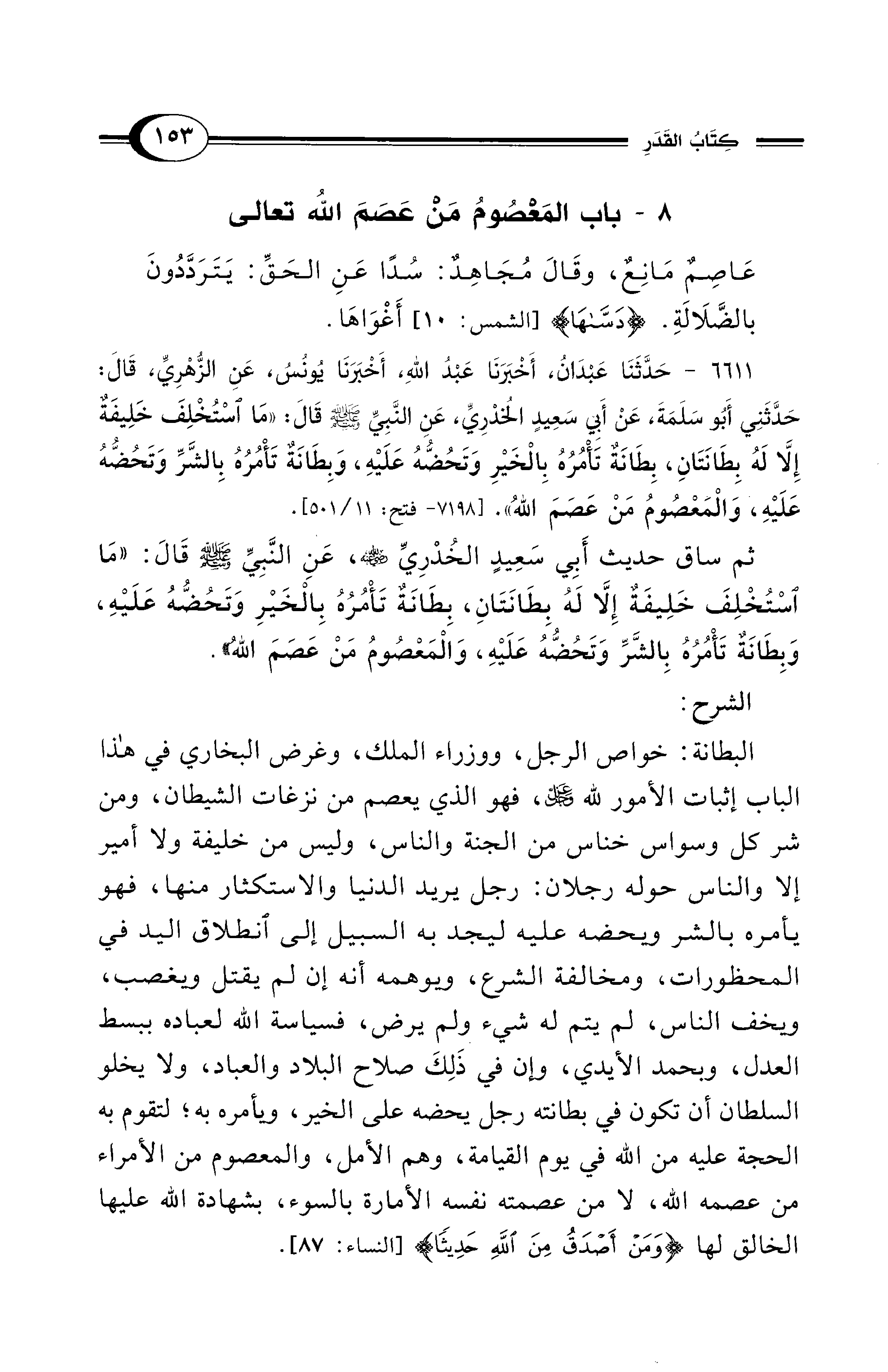 6611 - حَدَّثَنَا عَبْدَانُ، أَخْبَرَنَا عَبْدُ اللهِ، أَخْبَرَنَا يُونُسُ، عَنِ الزُّهْرِيِّ، قَالَ: حَدَّثَنِي أَبُو سَلَمَةَ، عَنْ أَبِي سَعِيدٍ الخُدْرِيِّ، عَنِ النَّبِيِّ - صلى الله عليه وسلم - قَالَ: «مَا اسْتُخْلِفَ خَلِيفَةٌ إِلاَّ لَهُ بِطَانَتَانِ، بِطَانَةٌ تَأْمُرُهُ بِالْخَيْرِ وَتَحُضُّهُ عَلَيْهِ، وَبِطَانَةٌ تَأْمُرُهُ بِالشَّرِّ وَتَحُضُّهُ عَلَيْهِ، وَالْمَعْصُومُ مَنْ عَصَمَ اللهُ». [7198 - فتح: 11/ 501].