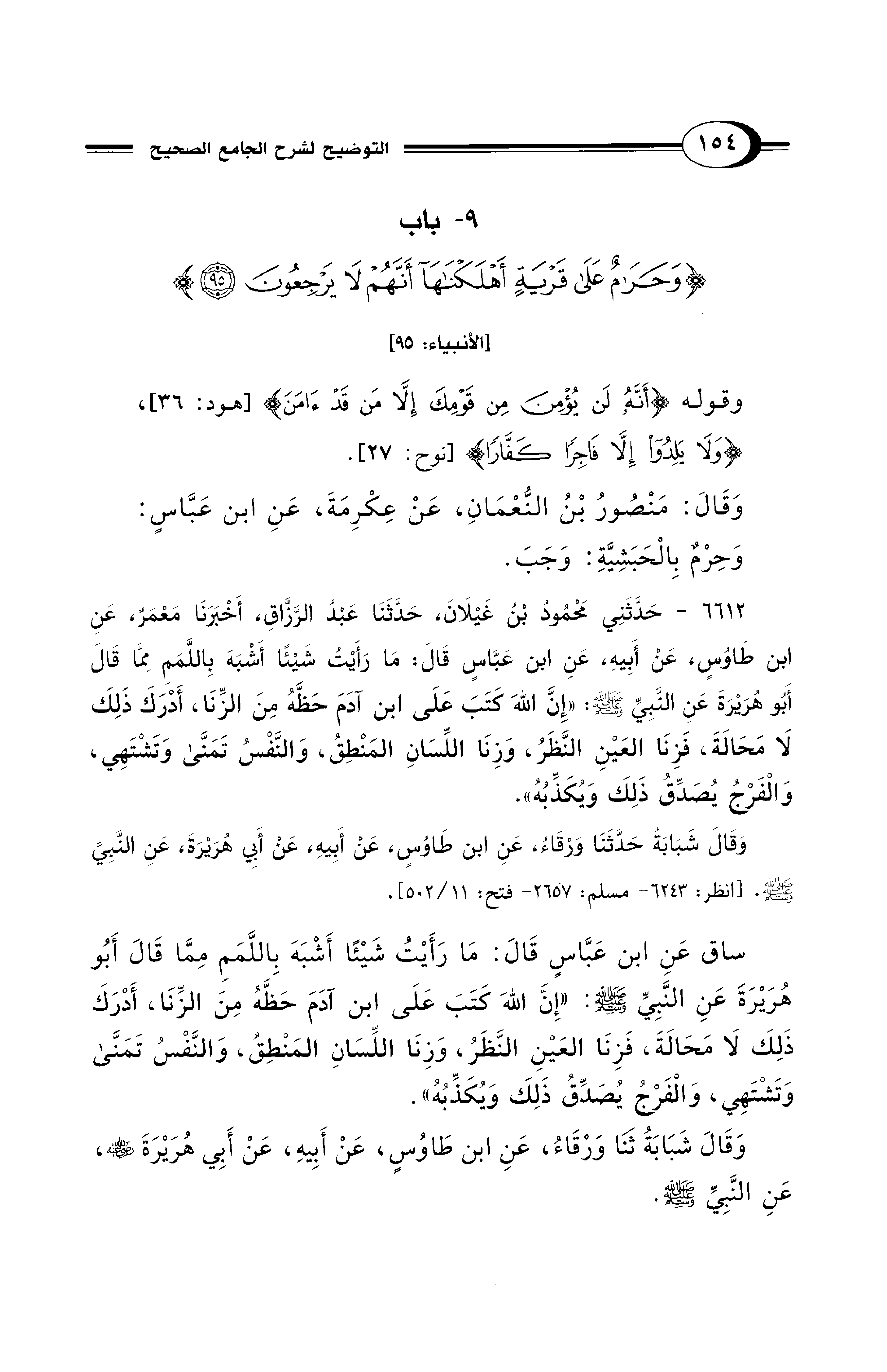 ساق عَنِ ابن عَبَّاسٍ قَالَ: مَا رَأَيْتُ شَيْئًا أَشْبَهَ بِاللَّمَمِ مِمَّا قَالَ أَبُو هُرَيْرَةَ عَنِ النَّبِيِّ - صلى الله عليه وسلم -: "إِنَّ اللهَ كَتَبَ على ابن آدَمَ حَظَّهُ مِنَ الزِّنَا، أَدْرَكَ ذَلِكَ لَا مَحَالَةَ، فَزِنَا العَينِ النَّظَرُ، وَزِنَا اللِّسَانِ المَنطِقُ، وَالنَّفْسُ تَمَنَّى وَتَشثتَهِي، وَالْفَرْجُ يُصَدِّقُ ذَلِكَ وَيُكَذِّبُهُ".