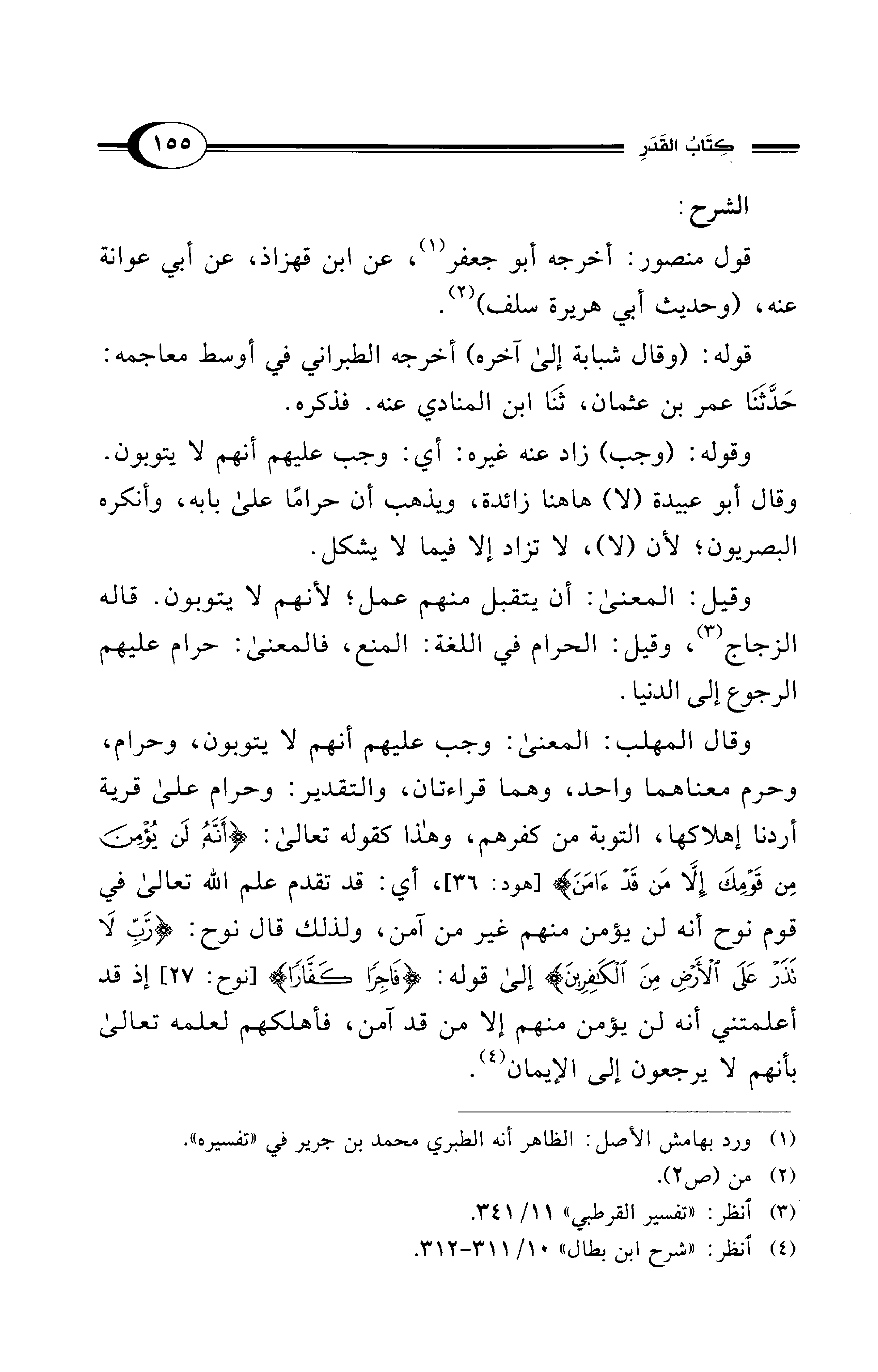 وقال المهلب: المعنى: وجب عليهم أنهم لا يتوبون، وحرام، وحرم معناهما واحد، وهما قراءتان، والتقدير: وحرام على قرية أردنا إهلاكها، التوبة من كفرهم، وهذا كقوله تعالى: {أَنَّهُ لَنْ يُؤْمِنَ مِنْ قَوْمِكَ إِلَّا مَنْ قَدْ آمَنَ} [هود: 36]، أي: قد تقدم علم الله تعالى في قوم نوح أنه لن يؤمن منهم غير من آمن، ولذلك قال نوح: {رَبِّ لَا تَذَرْ على الْأَرْضِ مِنَ الْكَافِرِينَ} إلى قوله: {فَاجِرًا كَفَّارًا} [نوح: 27]، إن قد أعلمتني أنه لن يؤمن منهم إلا من قد آمن، فأهلكهم لعلمه تعالى بأنهم لا يرجعون إلى الإيمان (¬4).
