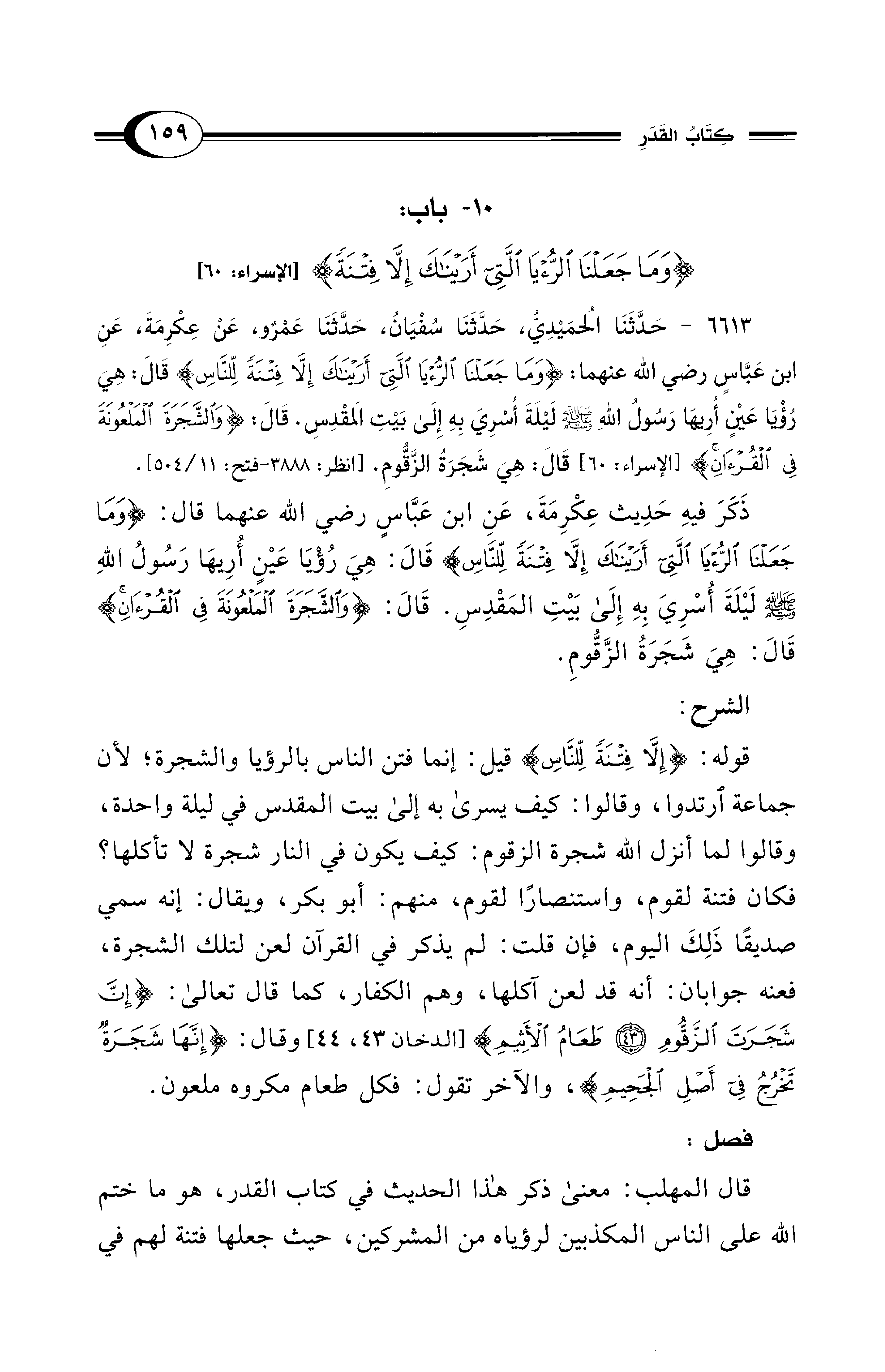 ذَكَرَ فيهِ حَدِيث عِكْرِمَةَ، عَنِ ابن عَبَّاسٍ - رضي الله عنهما - قال: {وَمَا جَعَلْنَا الرُّؤْيَا الَّتِي أَرَيْنَاكَ إِلاَّ فِتْنَةً لِلنَّاسِ} قَالَ: هِيَ رُؤْيَا عَيْنٍ أُرِيهَا رَسُولُ اللهِ - صلى الله عليه وسلم - لَيْلَةَ أُسْرِيَ بِهِ إِلَى بَيْتِ الْمَقْدِسِ. قَالَ: {وَالشَّجَرَةَ الْمَلْعُونَةَ فِي الْقُرْآنِ} قَالَ: هِيَ شَجَرَةُ الزَّقُّومِ.