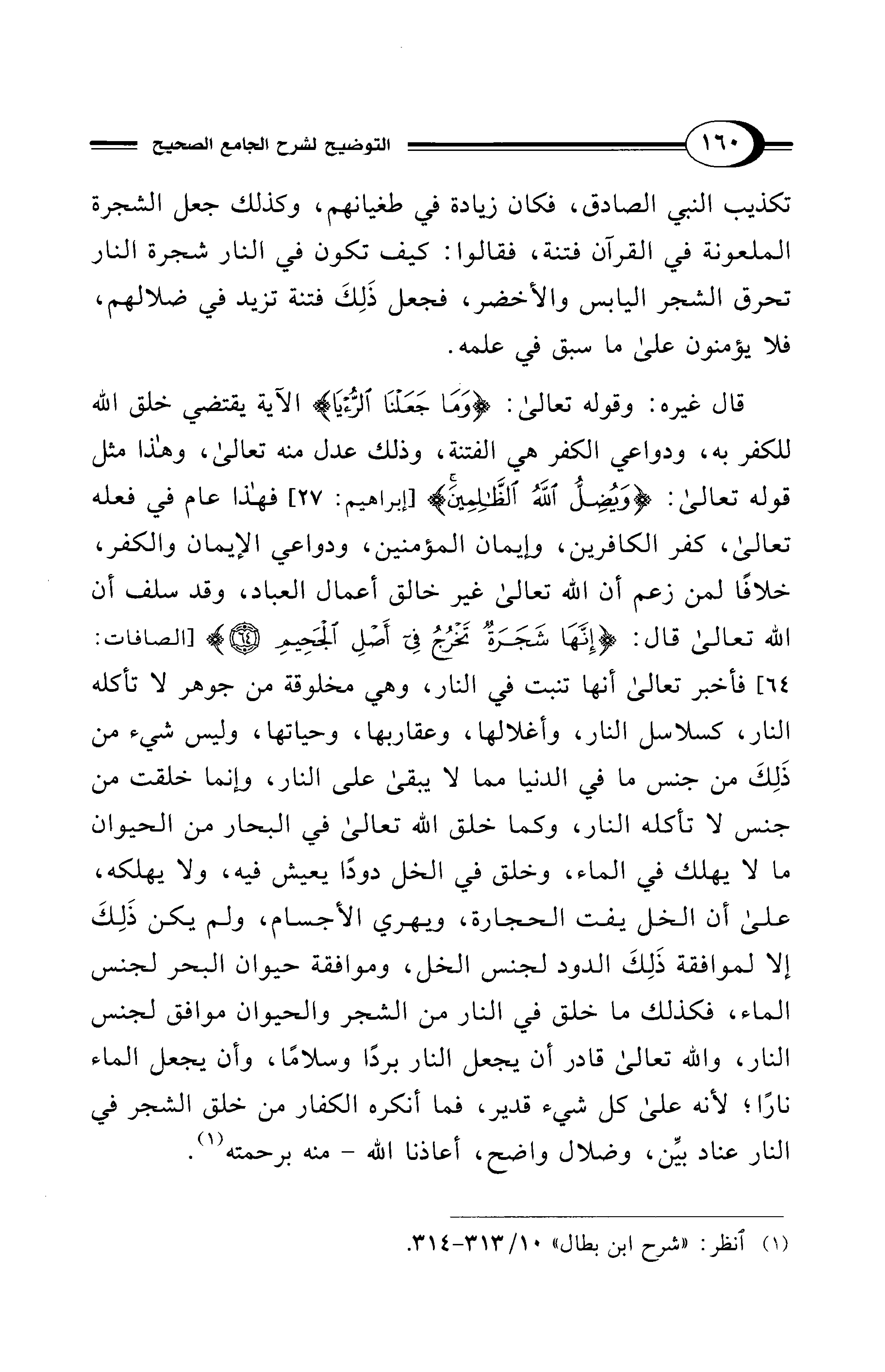 قال غيره: وقوله تعالى: {وَمَا جَعَلْنَا الرُّؤْيَا} الآية يقتضي خلق الله للكفر به، ودواعي الكفر هي الفتنة، وذلك عدل منه تعالى، وهذا مثل قوله تعالى: {وَيُضِلُّ اللهُ الظَّالِمِينَ} [إبراهيم: 27]، فهذا عام في فعله تعالى، كفر الكافرين، وإيمان المؤمنين، ودواعي الإيمان والكفر، خلافًا لمن زعم أن الله تعالى غير خالق أعمال العباد، وقد سلف أن الله تعالى قال: {إِنَّهَا شَجَرَةٌ تَخْرُجُ فِي أَصْلِ الْجَحِيمِ} [الصافات: 64] فأخبر تعالى أنها تنبت في النار، وهي مخلوقة من جوهر لا تأكله النار، كسلاسل النار، وأغلالها، وعقاربها، وحياتها، وليس شيء من ذَلِكَ من جنس ما في الدنيا بما لا يبقى على النار، وإنما خلقت من جنس لا تأكله النار، وكما خلق الله تعالى في البحار من الحيوان ما لا يهلك في الماء، وخلق في الخل دودًا يعيش فيه، ولا يهلكه، على أن الخل يفت الحجارة، ويهري الأجسام، ولم يكن ذَلِكَ إلا لموافقة ذَلِكَ الدود لجنس الخل، وموافقة حيوان البحر لجنس الماء، فكذلك ما خلق في النار من الشجر والحيوان موافق لجنس النار، والله تعالى قادر أن يجعل النار بردًا وسلامًا، وأن يجعل الماء نارًا؛ لأنه على كل شيء قدير، فما أنكره الكفار من خلق الشجر في النار عناد بيِّن، وضلال واضح، أعاذنا الله - منه برحمته (¬1).