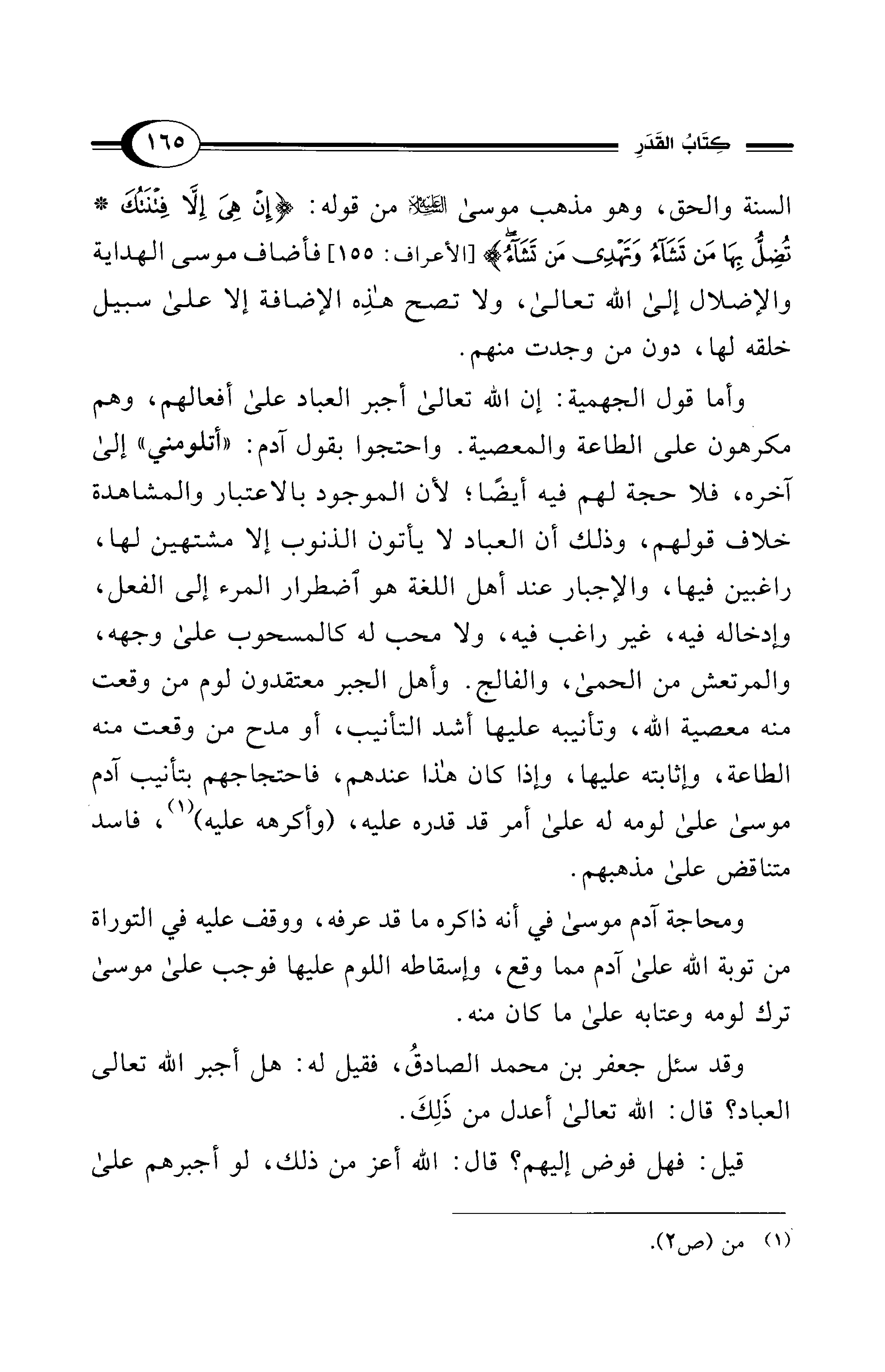وقد سئل جعفر بن محمد الصادقُ، فقيل له: هل أجبر الله تعالى العباد؟ قال: الله تعالى أعدل من ذَلِكَ.