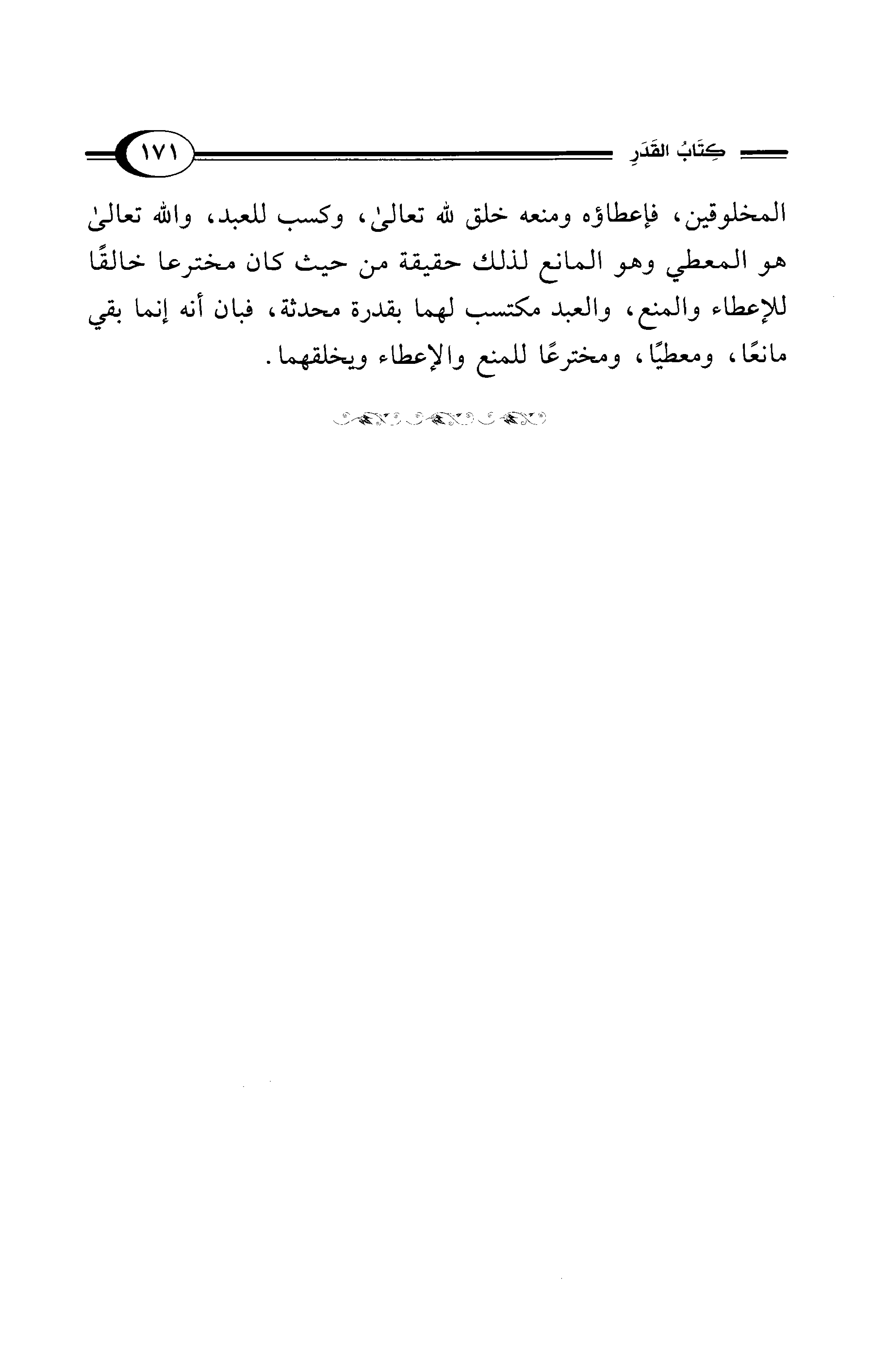 المخلوقين، فإعطاؤه ومنعه خلق لله تعالى، وكسب للعبد، والله تعالى هو المعطي وهو المانع لذلك حقيقة من حيث كان مخترعا خالقًا للإعطاء والمنع، والعبد مكتسب لهما بقدرة محدثة، فبان أنه إنما بقي مانعًا، ومعطيًا، ومخترعًا للمنع والإعطاء ويخلقهما.
