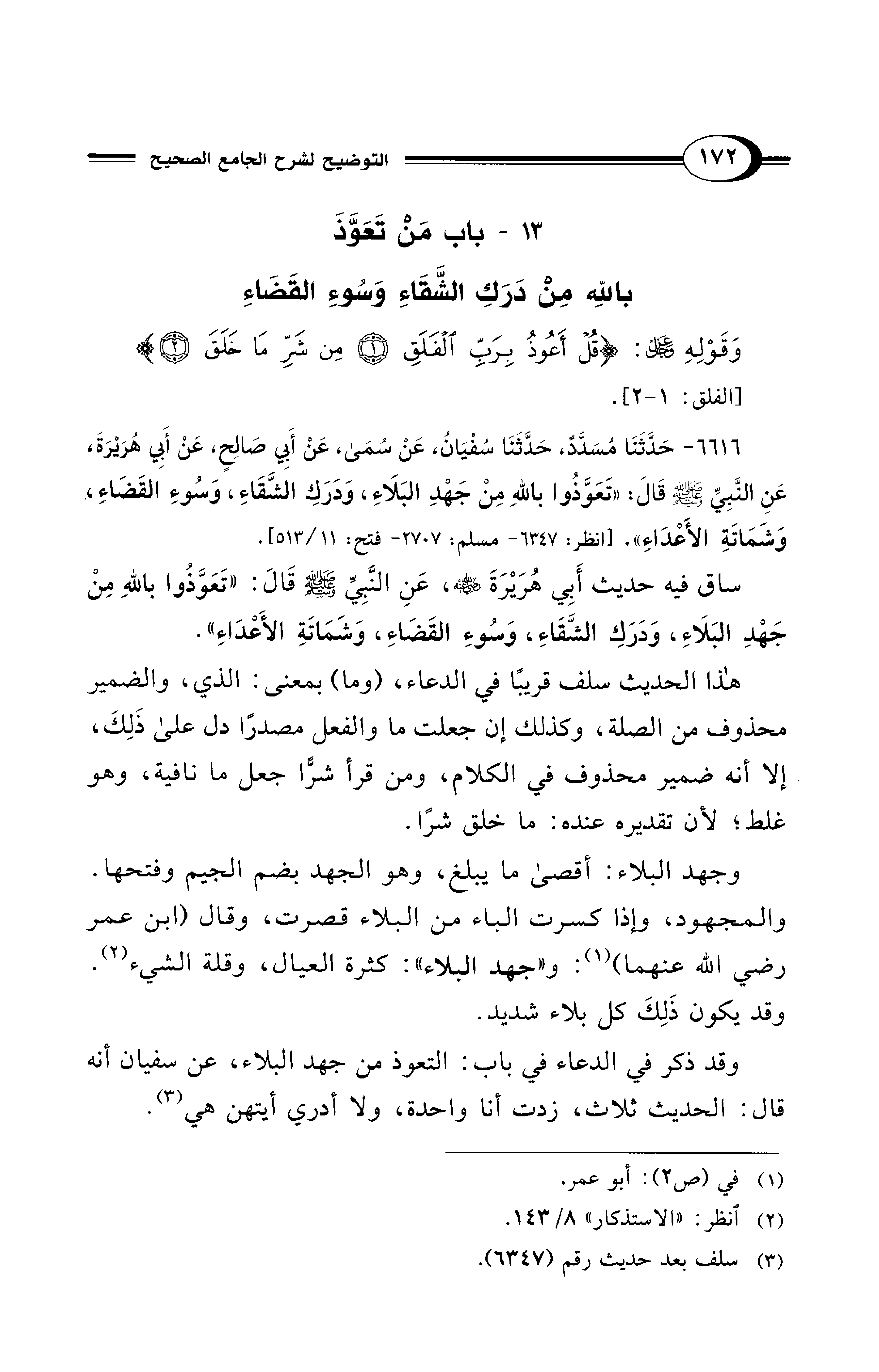 13 - باب مَنْ تَعَوَّذَ باللهِ مِنْ دَرَكِ الشَّقَاءِ وَسُوءِ القَضَاءِ وَقَوْلِهِ --عَزَّ وَجَلَّ--: {قُلْ أَعُوذُ بِرَبِّ الْفَلَقِ (1) مِنْ شَرِّ مَا خَلَقَ (2)} [الفلق 1 - 2]