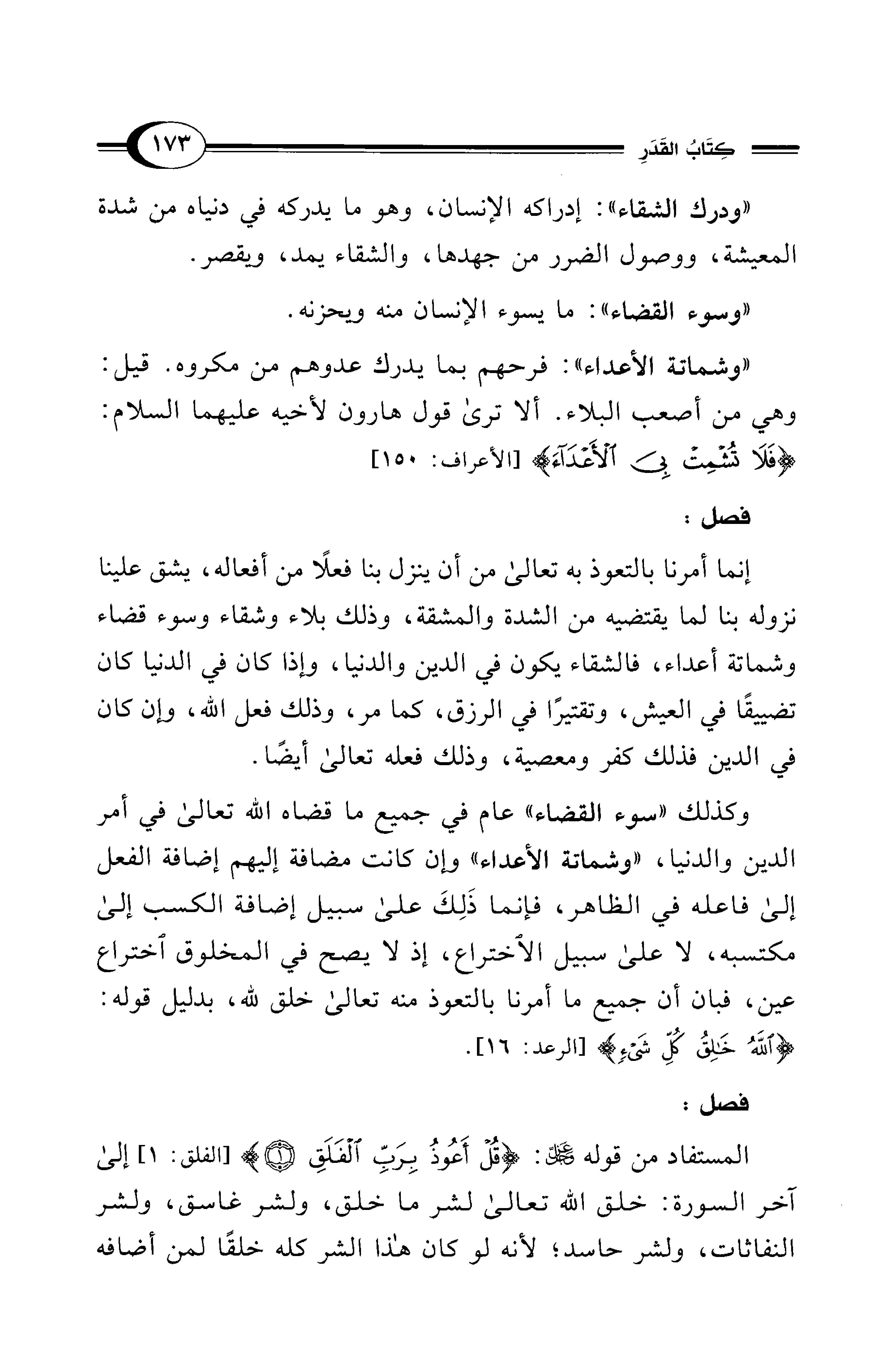 وكذلك "سوء القضاء" عام في جميع ما قضاه الله تعالى في أمر الدين والدنيا، "وشماتة الأعداء" وإن كانت مضافة إليهم إضافة الفعل إلى فاعله في الظاهر، فإنما ذَلِكَ على سبيل إضافة الكسب إلى مكتسبه، لا على سبيل الاختراع، إذ لا يصح في المخلوق اختراع عين، فبان أن جميع ما أمرنا بالتعوذ منه تعالى خلق لله، بدليل قوله: {اللهُ خَالِقُ كُلِّ شَيْءٍ} [الرعد: 16]