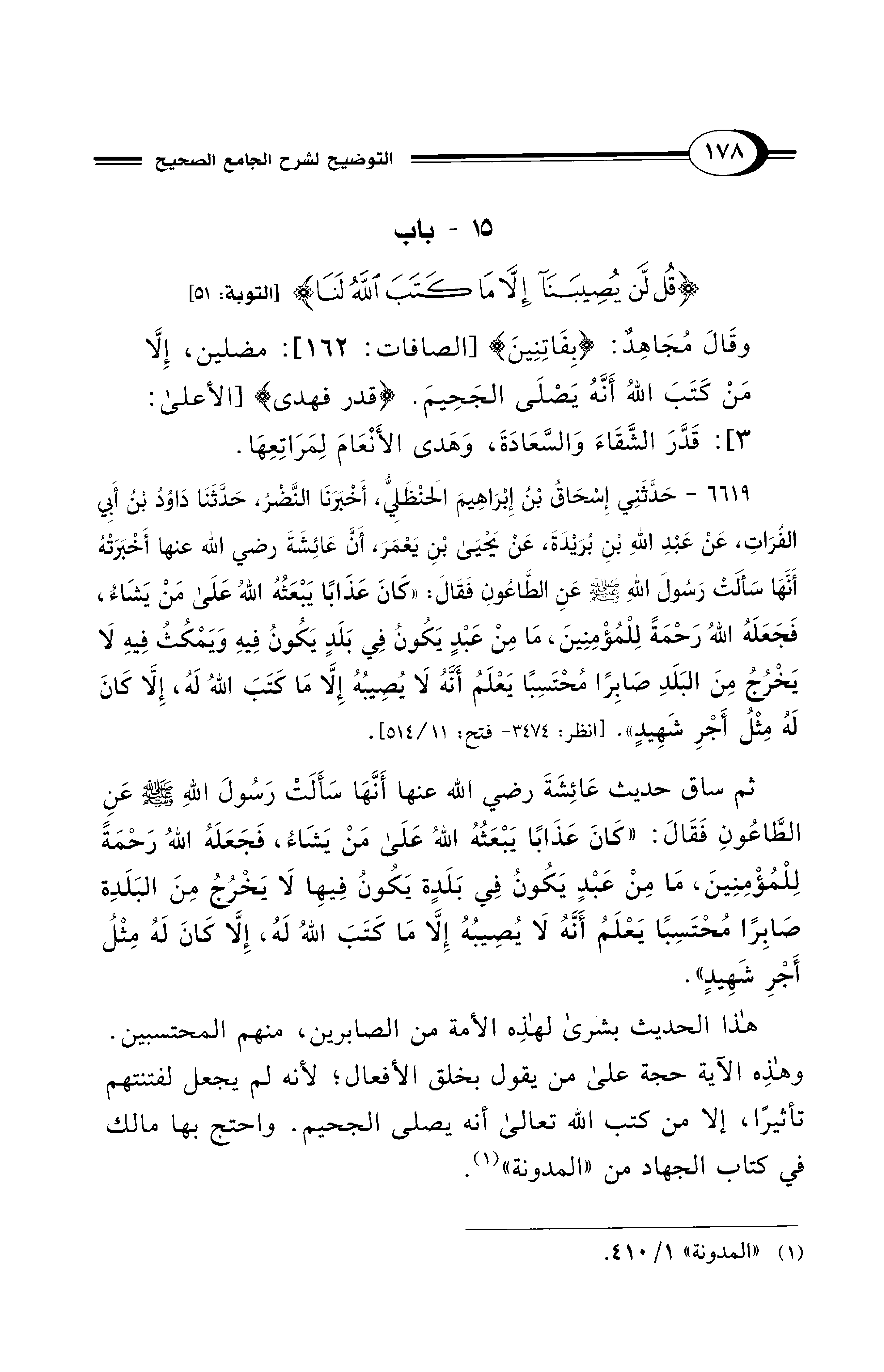 ثم ساق حديث عَائِشَةَ - رضي الله عنها - أَنَّهَا سَأَلَتْ رَسُولَ اللهِ - صلى الله عليه وسلم - عَنِ الطَّاعُونِ فَقَالَ: «كَانَ عَذَابًا يَبْعَثُهُ اللهُ عَلَى مَنْ يَشَاءُ، فَجَعَلَهُ اللهُ رَحْمَةً لِلْمُؤْمِنِينَ، مَا مِنْ عَبْدٍ يَكُونُ فِي بَلَدٍ يَكُونُ فِيهِا لاَ يَخْرُجُ مِنَ البَلَدِة صَابِرًا مُحْتَسِبًا يَعْلَمُ أَنَّهُ لاَ يُصِيبُهُ إِلاَّ مَا كَتَبَ اللهُ لَهُ، إِلاَّ كَانَ لَهُ مِثْلُ أَجْرِ شَهِيدٍ».