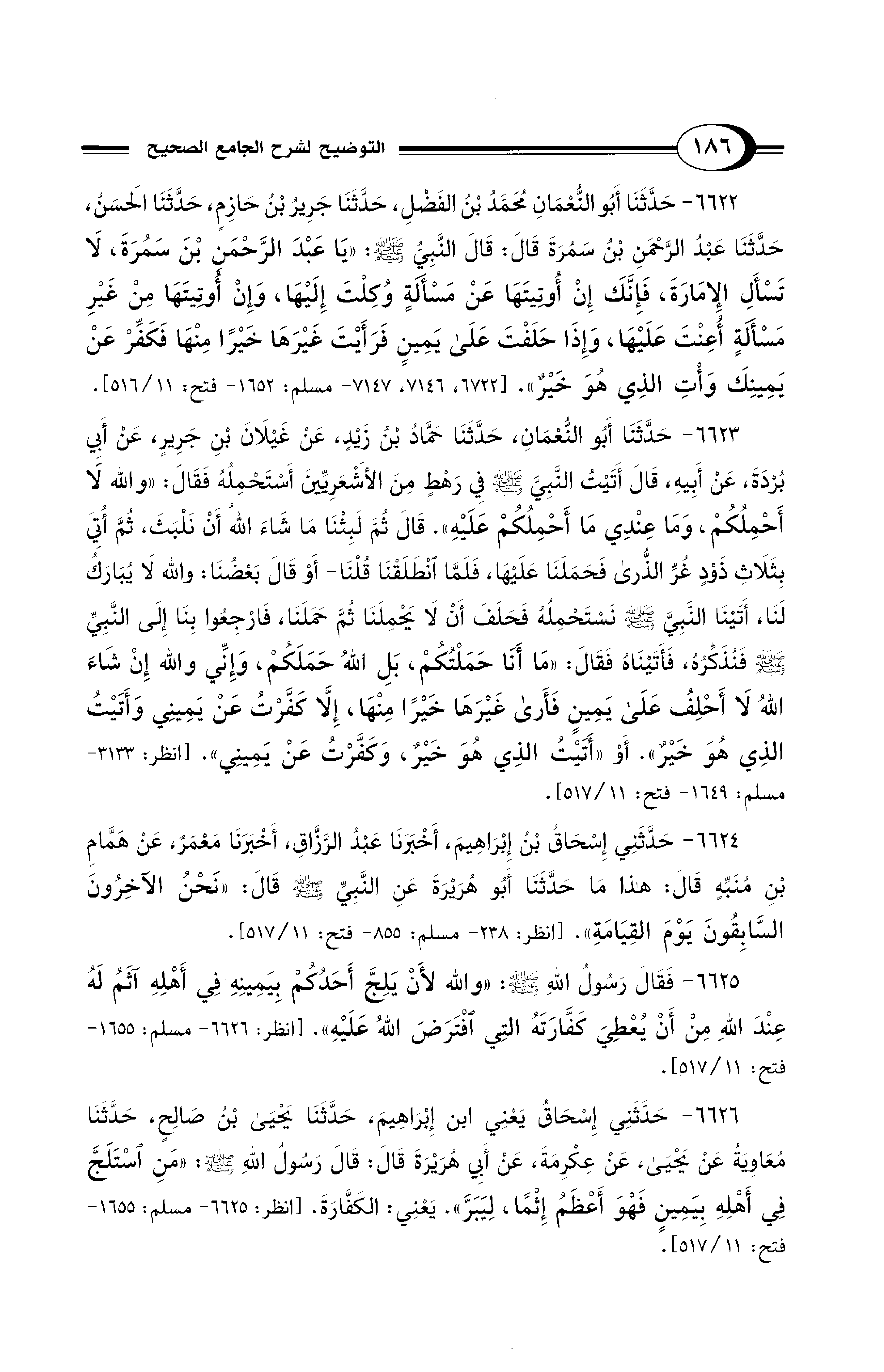 6622 - حَدَّثَنَا أَبُو النُّعْمَانِ مُحَمَّدُ بْنُ الْفَضْلِ، حَدَّثَنَا جَرِيرُ بْنُ حَازِمٍ، حَدَّثَنَا الْحَسَنُ، حَدَّثَنَا عَبْدُ الرَّحْمَنِ بْنُ سَمُرَةَ قَالَ: قَالَ النَّبِيُّ - صلى الله عليه وسلم -: «يَا عَبْدَ الرَّحْمَنِ بْنَ سَمُرَةَ لاَ تَسْأَلِ الإِمَارَةَ، فَإِنَّكَ إِنْ أُوتِيتَهَا عَنْ مَسْأَلَةٍ وُكِلْتَ إِلَيْهَا، وَإِنْ أُوتِيتَهَا مِنْ غَيْرِ مَسْأَلَةٍ أُعِنْتَ عَلَيْهَا، وَإِذَا حَلَفْتَ عَلَى يَمِينٍ فَرَأَيْتَ غَيْرَهَا خَيْرًا مِنْهَا، فَكَفِّرْ عَنْ يَمِينِكَ، وَأْتِ الَّذِي هُوَ خَيْرٌ» [6722، 7146، 7147 - مسلم: 1652 - فتح:11/ 516].